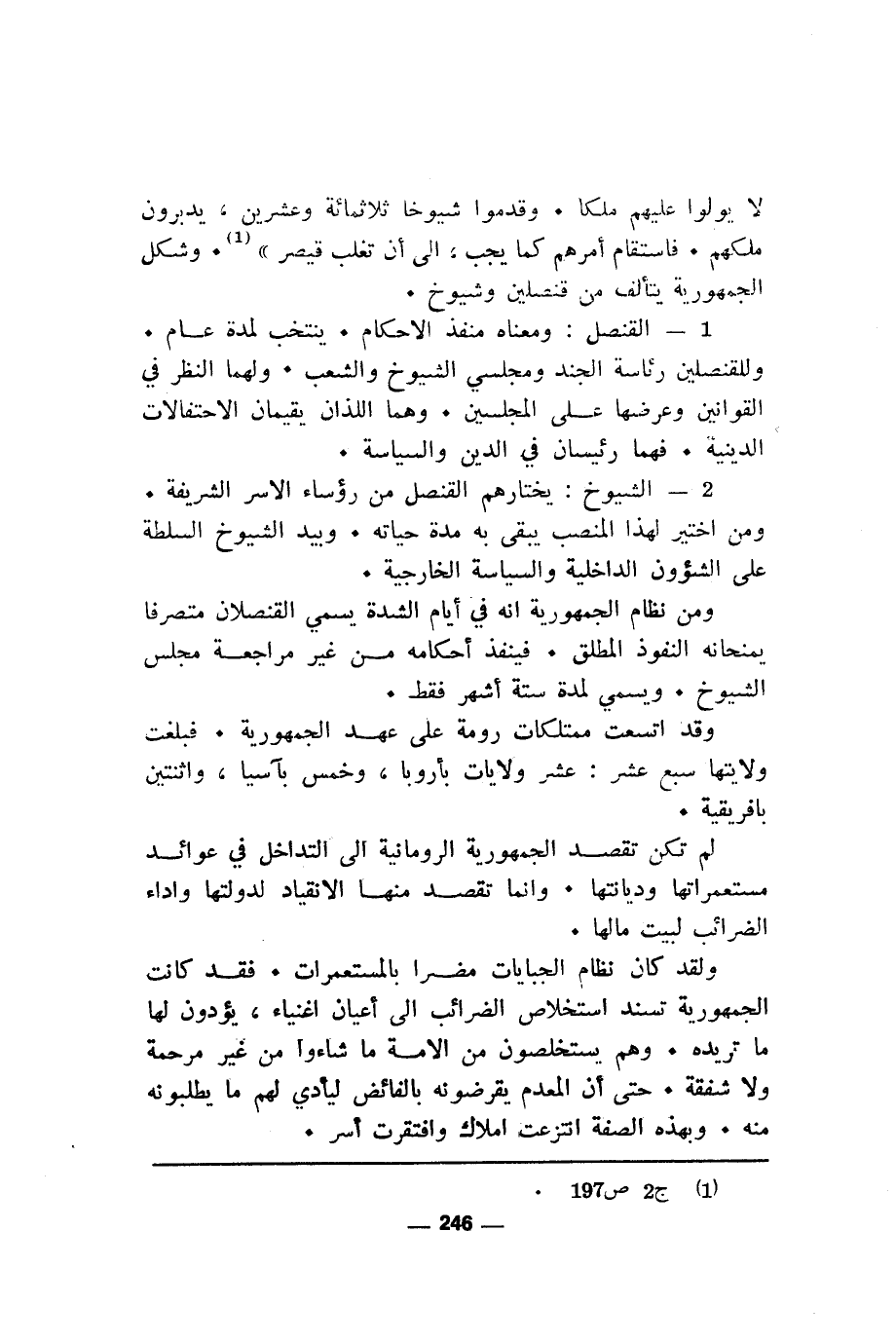 لا يولوا عليهم ملكا. وقدموا شيوخا ثلاثمائة وعشرين. يدبرون ملكهم. فاستقام أمرهم كما يجب، الى أن تغلب قيصر"، (¬1). وشكل الجمهورية يتألف من قنصلين وشيوخ.