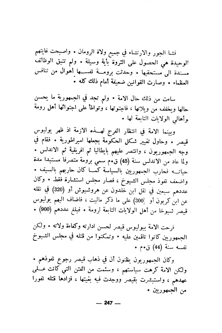وبينما الأمة في انتظار الفرج لهذه الازمة اذ ظهر يوليوس قيصر. وحاول تغيير شكل الحكومة بجعلها امبراطورية. فقام في وجه الجمهوريون، وانتصر عليهم بايطاليا ثم أفريقية ثم الاندلس. ولما عاد من الاندلس سنة (45) ق. م سمي برومة متصرفا مستبدا مدة حياته فحارب الجمهوريين بالسياسة كما كان حاربهم بالسيف. واضعف نفوذ مجلس الشيوخ، فصار مجلس استشارة فقط. وكان عددهم سبعين في نقل ابن خلدون عن هروشيوش أو (320) في نقله عن ابن كريون أو (300) على ما ذكر ماليت، فاضاف اليهم. يوليوس قيصر شيوخا من أهل الولايات التابعة لرومة. فبلغ عددهم (900).