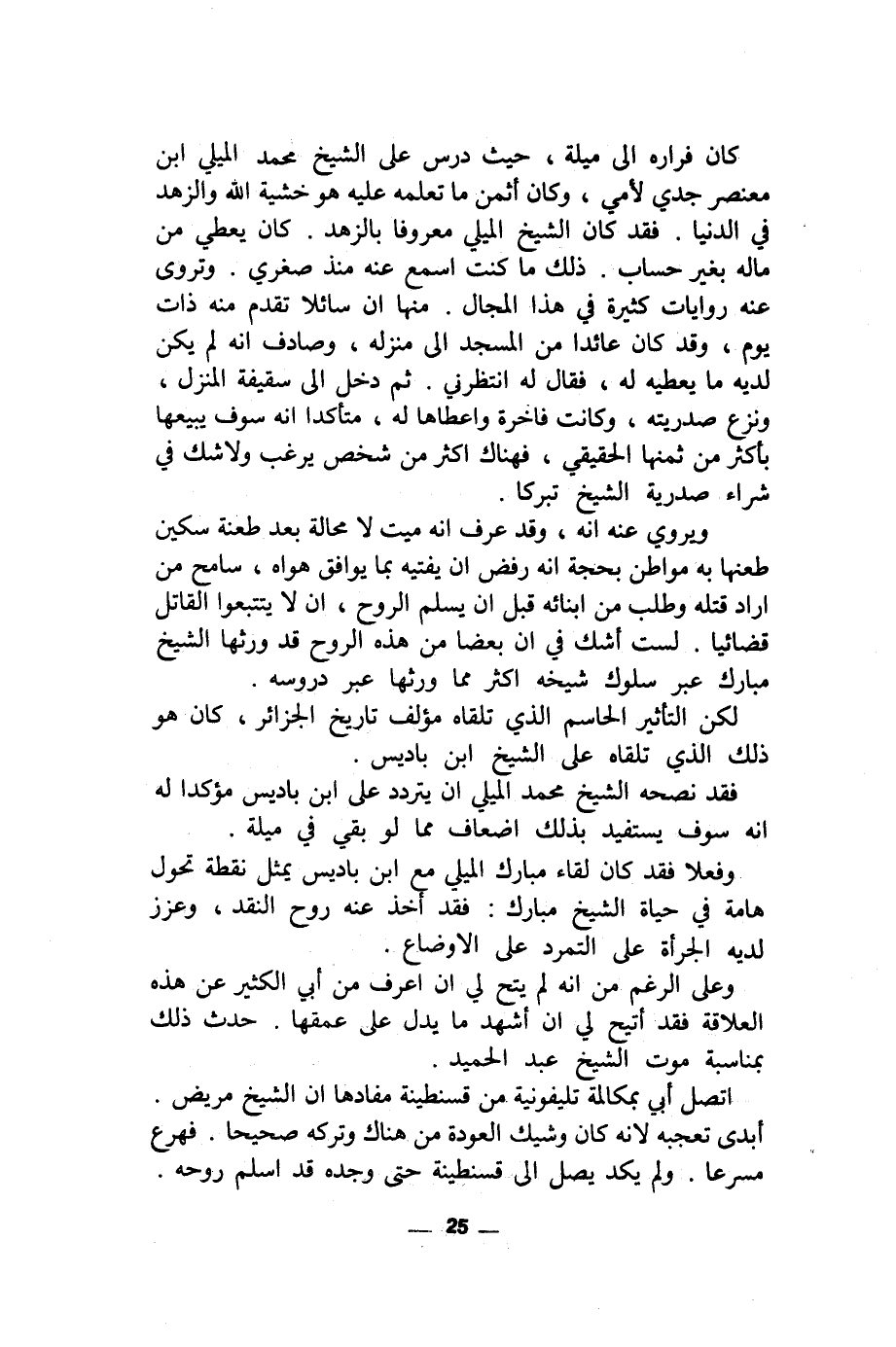 كان فراره الى ميلة، حيث درس على الشيخ محمد الميلي ابن معنصر جدي لأمي، وكان أثمن ما تعلمه عليه هو خشية الله والزهد في المدنيا. فقد كان الشيخ الميلي معروفا بالزهد. كان يعطي من ماله بغير حساب. ذلك ما كنت اسمع عنه منذ صغري. وتروى عنه روايات كثيرة في هذا المجال. منها ان سائلا تقدم منه ذات يوم، وقد كان عائدا من المسجد الى منزله، وصادف انه لم يكن لديه ما يعطيه له، فقال له انتظرني. ثم دخل الى سقيفة المنزل، ونزع صدريته، وكانت فاخرة واعطاها له، متأكدا انه سوف يبيعها بأكثر من ثمنها الحقيقي، فهناك اكثر من شخص يرغب ولا شك في شراء صدرية الشيخ تبركا.