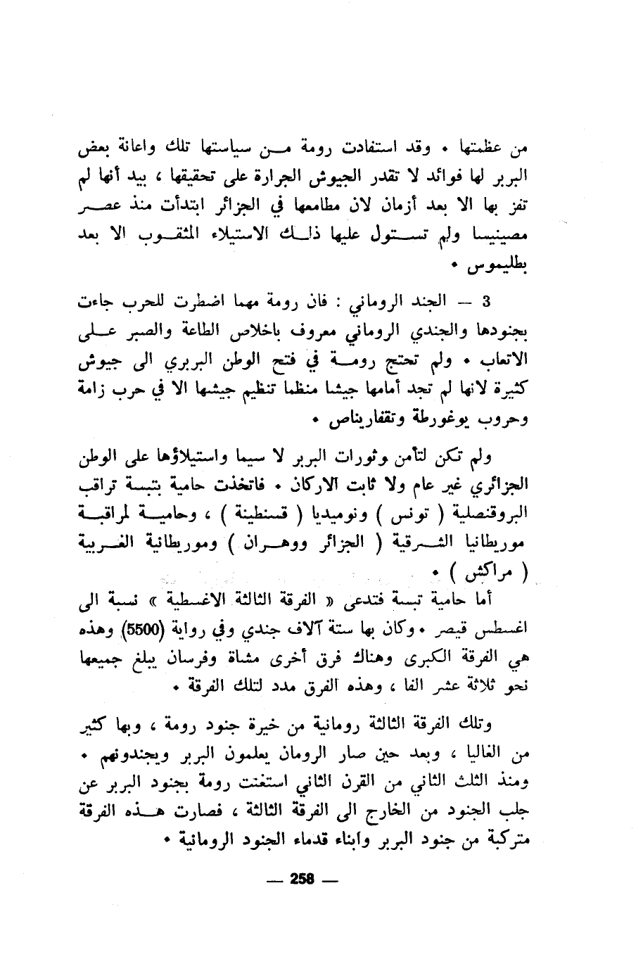 من عظمتها. وقد استفادت رومة من سياستها تلك واعانة بعض البربر لها فوائد لا تقدر الجيوش الجرارة على تحقيقها، بيد أنها لم تفز بها الا بعد أزمان لان مطامعها في الجزائر ابتدأت منذ عصر مصينيسا ولم تستول عليها ذلك الاستيلاء المثقوب الا بعد بطليموس.