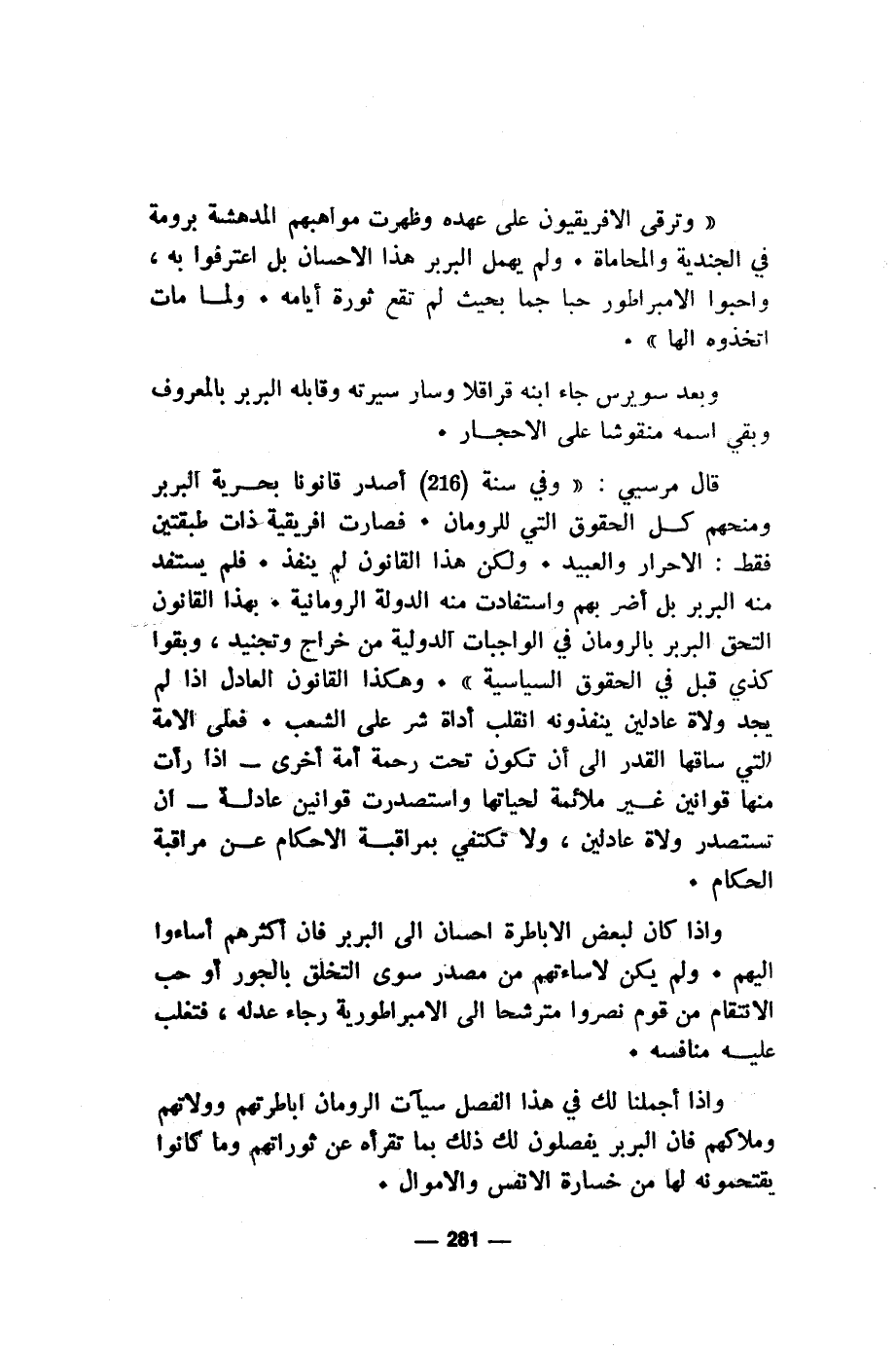 قال مرسيي: "وفي سنة (216) أصدر قانونا بحرية البربر ومنحهم كل الحقوق التي للرومان. فصارت أفريقية ذات طبقتين فقط: الاحرار والعبيد. ولكن هذا القانون لم ينفذ. فلم يستفد منه البربر بل أضر بهم واستفادت منه الدولة الرومانية. بهذا القانون التحق البربر بالرومان في الواجبات الدولية من خراج وتجنيد، وبقوا كذي قبل في الحقوق السياسية". وهكذا القانون العادل إذا لم يجد ولاة عادلين ينفذونه انقلب أداة شر على الشعب. فعلى الأمة التي ساقها القدر إلى أن تكون تحت رحمة أمة أخرى- اذا رأت منها قوانين غير ملائمة لحياتها واستصدرت قوانين عادلة- ان تستصدر ولاة عادلين، ولا تكتفي بمراقبة الاحاكام عن مراقبة الحكام.