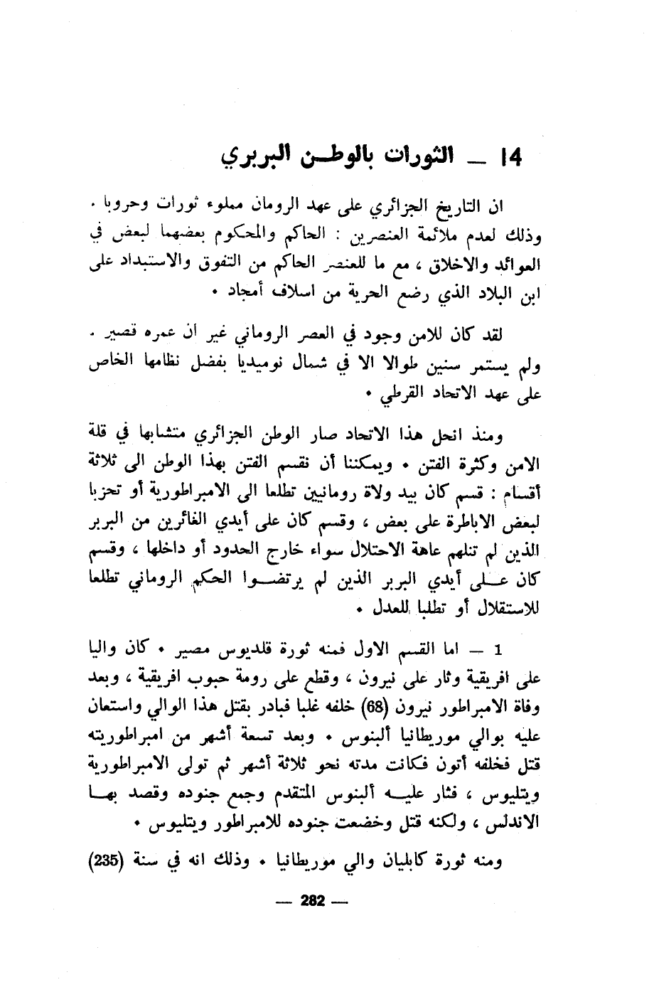 ان التاريخ الجزائري على عهد الرومان مملوء ثورات وحروبا. وذلك لعدم ملائمة العنصرين: الحاكم والمحكوم بعضهما لبعض في العوائد والاخلاق، مع ما للعنصر الحاكم من التفوق والاستبداد على ابن البلاد الذي رضع الحرية من اسلاف أمجاد.
