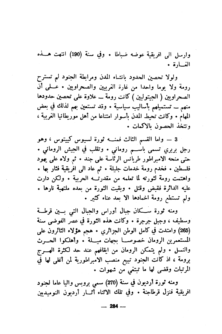 3 - واما القسم الثالث فمنه ثورة لسيوس كييتوس، وهو رجل بربري تسمى باسم روماني. وتقلب في الجيش الروماني. حتى منحه الامبراطور طريانس الرئاسة على جند. ثم ولاه على يهود فلسطين. فخدم رومة خدمات جليلة. ثم عاد الى افريقية فثار بها. واهتمت رومة لثورته لما تعلمه من مقدرته الحربية. ولكن دارت عليه الدائرة فقبض وقتل. وبقيت الثورة من بعده ملتهبة نارها. ولم تستطع رومة اخمادها الا بعد عناء كثير.