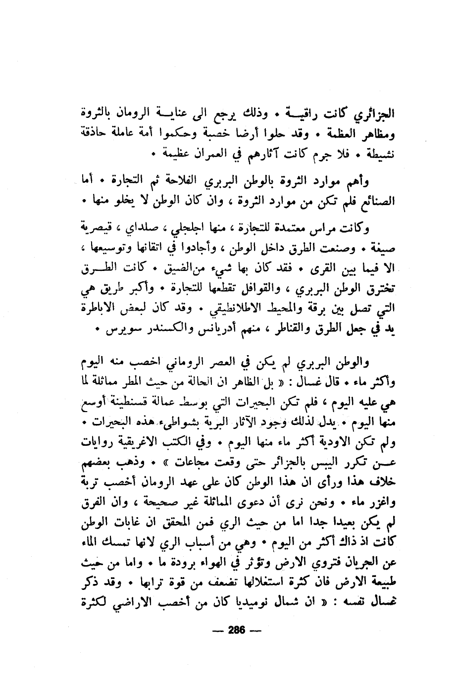 والوطن البربري لم يكن في العصر الروماني اخصب منه اليوم وأكثر ماء. قال غسال: "بل الظاهر ان الحالة من حيث المطر مماثلة لما هي عليه اليوم، فلم تكن البحيرات التي بوسط عمالة قسنطينة أوسع منها اليوم. يدل لذلك وجود الآثار البرية بشواطئ هذه البحيرات. ولم تكن الاودية أكثر ماء منها اليوم. وفي الكتب الاغريقية روايات عن تكرر اليبس بالجزائر حتى وقعت مجاعات". وذهب بعضهم خلاف هذا ورأى ان هذا الوطن كان على عهد الرومان أخصب تربة واغزر ماء. ونحن نرى أن دعوى المماثلة غير صحيحة، وأن الفرق لم يكن بعيدا جدا اما من حيث الري فمن المحقق ان غابات الوطن كانت اذ ذاك أكثر من اليوم. وهي من أسباب الري لانها تمسك الماء عن الجريان فتروي الارض وتؤثر في الهواء برودة ما. واما من حيث طبيعة الارض فان كثرة استغلالها تضعف من قوة ترابها. وقد ذكر غسال نفسه: " ان شمال نوميديا كان من أخصب الاراضي لكثرة