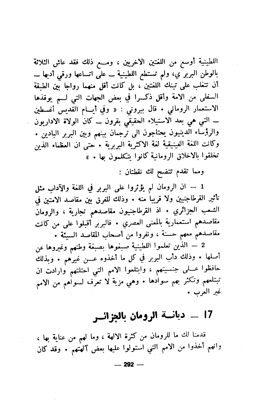 1 - ان الرومان لم يؤثروا على البربر في اللغة والآداب مثل تأثير القرطاجنيين ولا قريبا منه. وذلك للفرق بين مقاصد الامتين في الشعب الجزائري. اذ القرطاجنيون مقاصدهم تجارية، والرومان مقاصدهم استعمارية بالمعنى العصري. فالبربر أقبلوا على من كانت مقاصدهم معهم حسنة، ونفروا من أصحاب المقاصد السيئة.