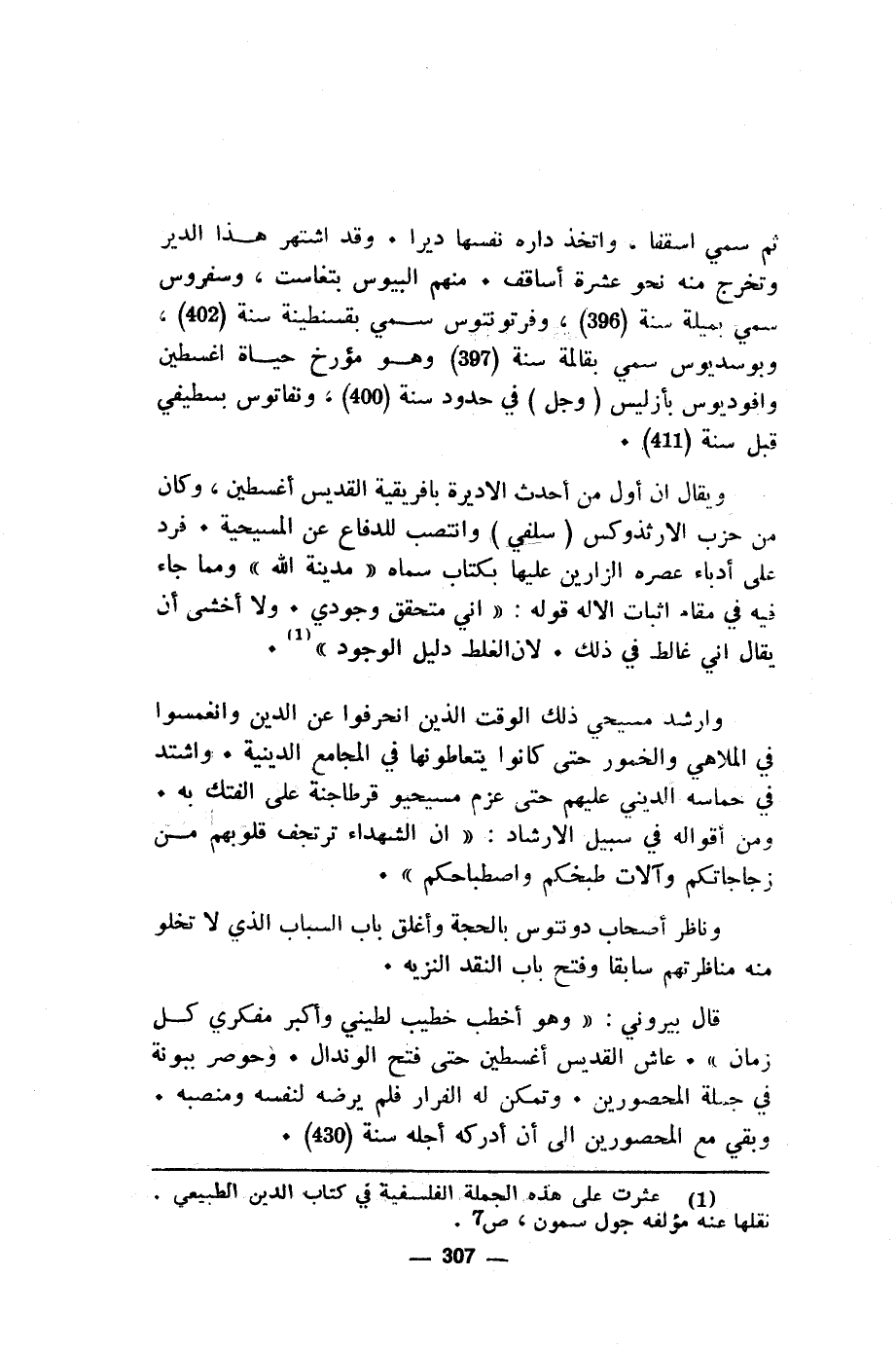 ويقال ان أول من أحدث الاديرة بأفريقية القديس أغسطين، وكان من حزب الارثذوكس (سلفي) وانتصب للدفاع عن المسيحية. فرد على أدباء عصره الزارين عليها بكتاب سماه "مدينه الله" ومما جاء فيه في ماقام اثبات الاله قوله: "اني متحقق وجودي. ولا أخشى أن يقال اني غالط في ذلك. لان الغلط دليل الوجود" (¬1).