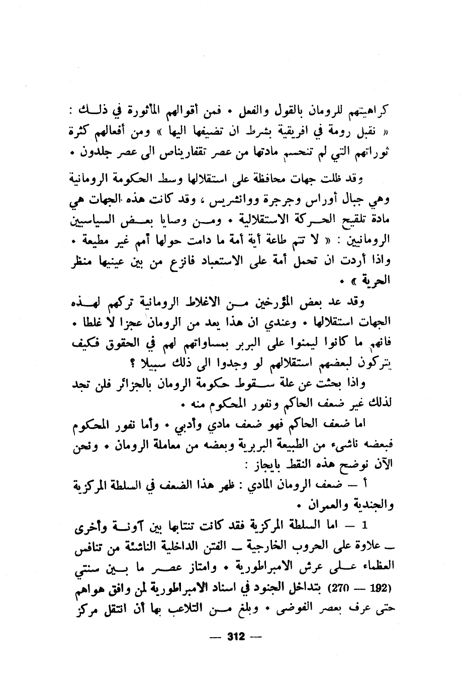 اما ضعف الحاكم فهو ضعف مادي وأدبي. وأما نفور المحكوم فبعضه ناشئ من الطبيعة البربرية وبعضه من معاملة الرومان. ونحن الآن نوضح هذه النقط بايجاز: