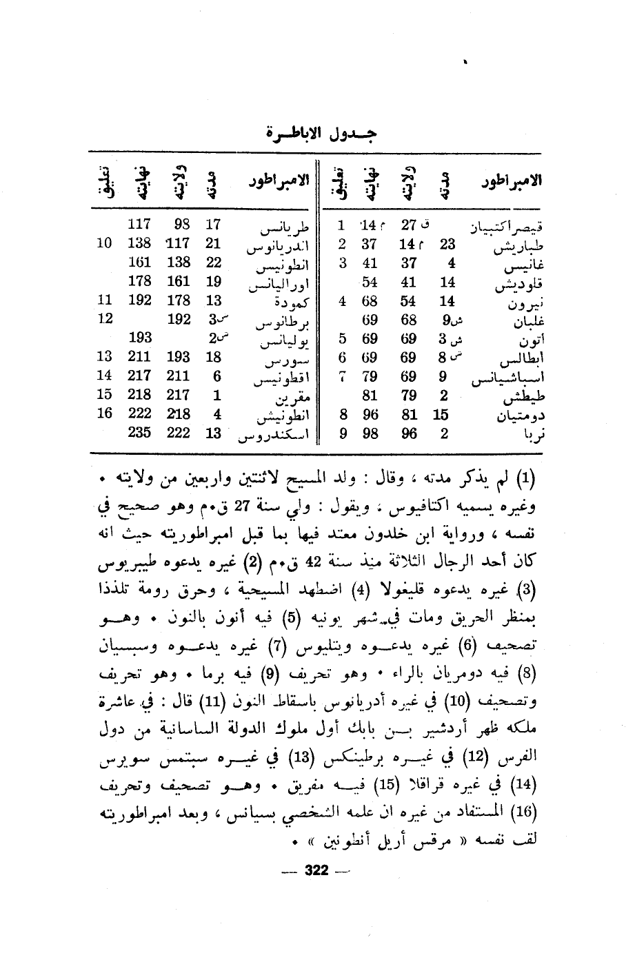 (1) لم يذكر مدته، وقال: ولد المسيح لاثنتين واربعين من ولايته. وغيره يسميه اكتافيوس، ويقول: ولي سنة 27 ق. م وهو صحيح في نفسه، ورواية ابن خلدون معتد فيها بما قبل امبراطوريته حيث انه كان أحد الرجال الثلاثة منذ سنة 42 ق. م (2) غيره يدعوه طيبربوس (3) غيره يدعوه قليغولا (4) اضطهد المسيحية، وحرق رومة تلذذا بمنظر الحريق ومات في شهر يونيه (5) شبه أنون بالنون. وهو تصحيف (6) غيره يدعوه ويتليوس (7) غيره يدعوه وسبسيان (8) فيه دومريان بالراء. وهو تحريف (9) فيه برما. وهو تحريف وتصحيف (10) في غيره أدريانوس باسقاط النون (11) قال: في عاشرة ملكه ظهر أردشير بن بابك أول ملوك الدولة الساسانية من دول الفرس (12) في غيره برطينكس (13) في غيره سبتمس سويرس (14) في غيره قاقلا (15) فيه مفريق. وهو تصحيف وتحريف (16) المستفاد من غيره ان علمه الشخص بسيانس، وبعد امبراطوريته لقب نفسه "مرقس أريل أنطونين".