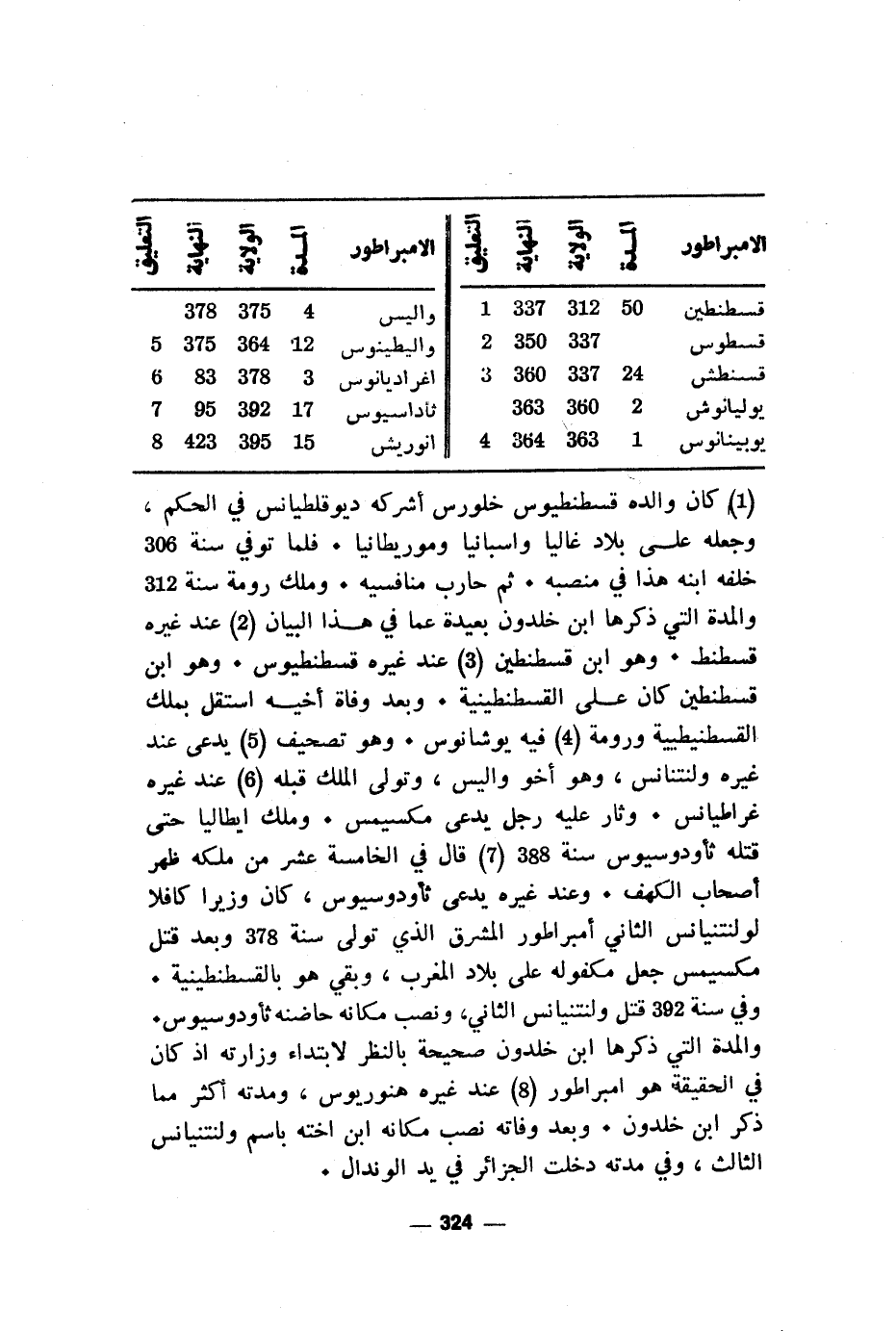 (1) كان والده قسطنطيوس خلورس أشركه ديوقلطيانس في الحكم، وجعله على بلاد غاليا واسبانيا وموريطانيا. فلما توفي سنة 306 خلفه ابنه هذا في منصبه. ثم حارب منافسيه. وملك رومة سنة 312 والمدة التي ذكرها ابن خلدون بعيدة عما في هذا البيان (2) عند غيره قسطنط. وهو ابن قسطنطين (3) عند غيره قسطنطيوس. وهو ابن قسطنطين كان على القسطنطينية. وبعد وفاة أخيه استقل بملك القسطنيطنية ورومة (4) فيه يوشانوس. وهو تصحيفا (5) يدعى عند غيره ولنتنانس، وهو أخو واليس، وتولى الملك قبله (6) عند غيره غراطيانس. وثار عليه رجل يدعى مكسيمس. وملك ايطاليا حتى قتله ثأودوسيوس سنة 388 (7) قال في الخامسة عشر من ملكه ظهر أصحاب الكهف. وعند غيره يدعى ثأودوسيوس، كان وزيرا كافلا لولنتنيانس الثاني امبراطور الشرق الذي تولى سنة 378 وبعد قتل مكسيمس جعل مكفوله على بلاد المغرب، وبقي هو بالقسطنطينية. وفي سنة 392 قتل ولنتنيانس الثاني، ونصب مكانه حاضنه ثأودوسيوس. والمدة التي ذكرها ابن خلدون صحيحة بالنظر لابتداء وزارته إذ كان في الحقيقة هو امبراطور (8) عند غيره هنوريوس، ومدته أكثر مما ذكر ابن خلدون. وبعد وفاته نصب مكانه ابن أخته باسم ولنتنيانس