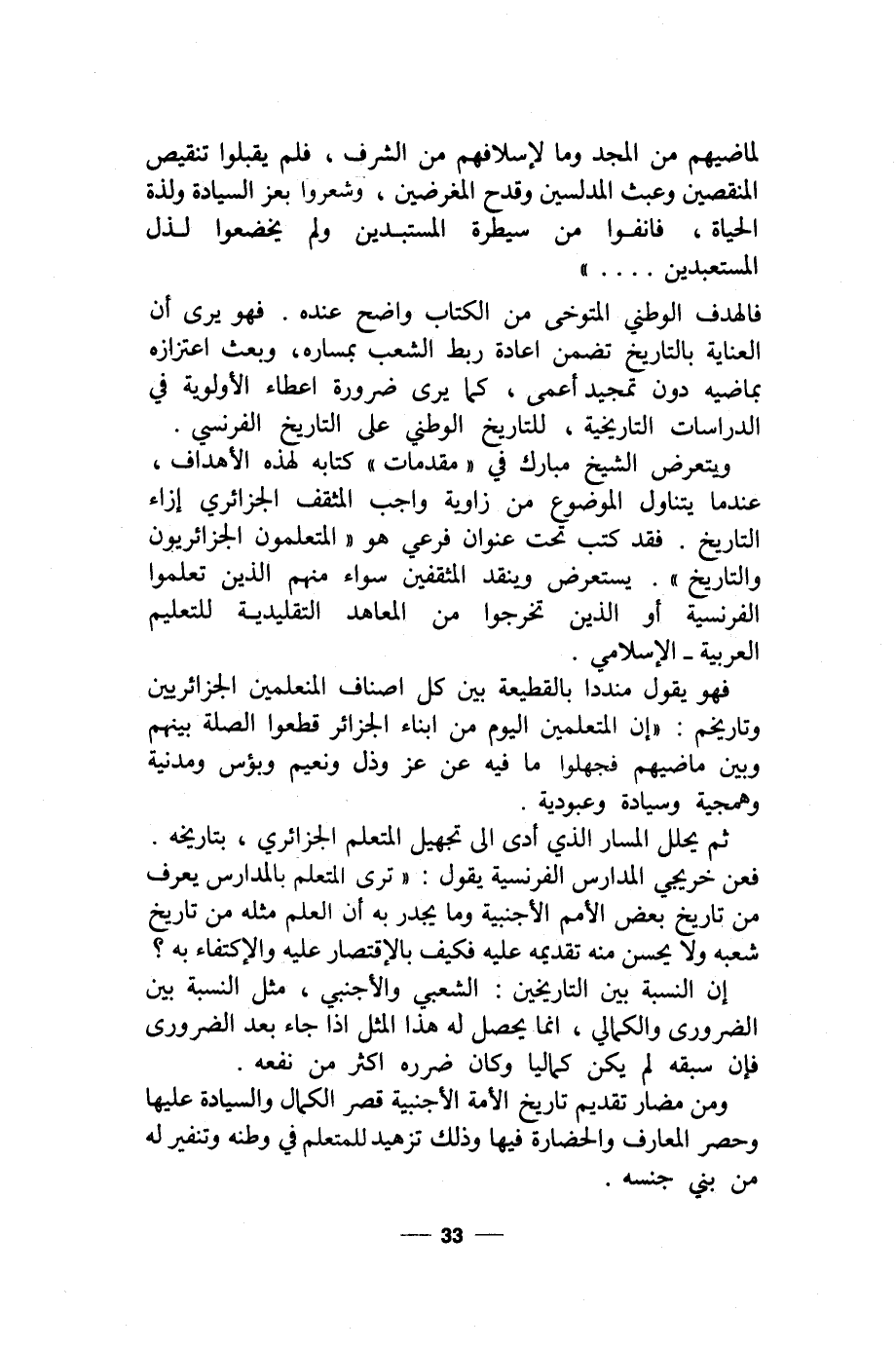 ثم يحلل المسار الذي أدى الى تجهيل المتعلم الجزائري، بتاريخه. فعن خريجي المدارس الفرنسية يقول: "ترى المتعلم بالمدارس يعرف من تاريخ بعض الأمم الأجنبية وما يجدر به أن العلم مثله من تاريخ شعبه ولا يحسن منه تقديمه عليه فكيف بالإقتصار عليه والإكتفاء به؟