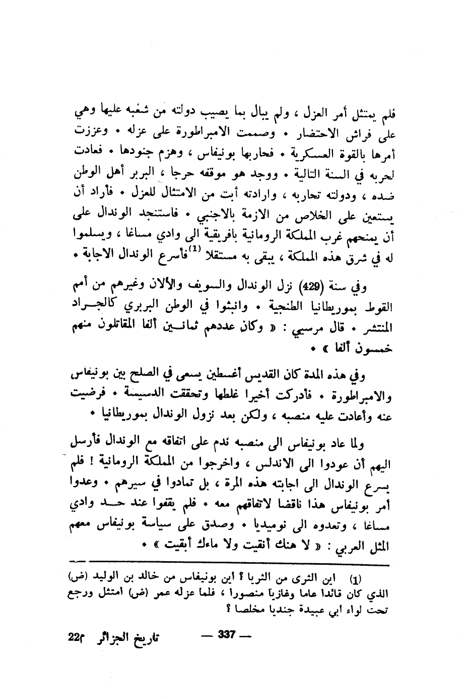 فلم يمتثل أمر العزل، ولم يبال بما يصيب دولته من شغبه عليها وهي على فراش الاحتضار. وصممت الامبراطورة على عزله. وعززت أمرها بالقوة العسكرية. فحاربها بونيفاس، وهزم جنودها. فعادت لحربه في السنة التالية. ووجد هو موقفه حرجا، البربر أهل الوطن ضده، ودولته تحاربه، وارادته أبت من الامتثال للعزل. فأراد أن يستعين على الخلاص من الازمة بالاجنبي. فاستنجد الوندال على أن يمنحهم غرب المملكة الرومانية بأفريقية الى وادي مساغا، ويسلموا له في شرق هذه المملكة، يبقى به مستقلا (¬1) فأسرع الوندال الاجابة.