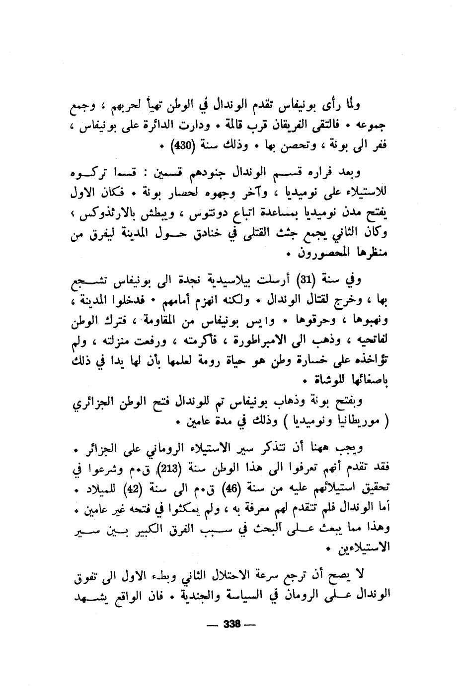 ويجب ههنا أن نتذكر سير الاستيلاء الروماني على الجزائر. فقد تقدم أنهم تعرفوا الى هذا الوطن سنة (213) ق. م وشرعوا في تحقيق استيلائهم عليه من سنة (46) ق. م الى سنة (42) للميلاد. أما الوندال فلم تتقدم لهم معرفة به، ولم يمكثوا في فتحه غير عامين. وهذا مما يبعث على البحث في سبب الفرق الكبير بين سير الاستيلاءين.