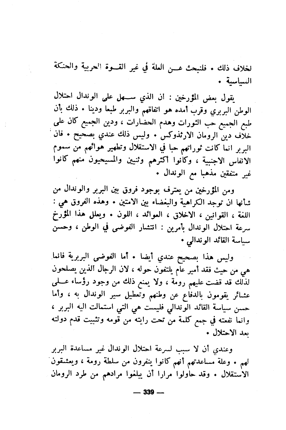 يقول بعض المؤرخين: أن الذي سهل على الوندال احتلال الوطن البربري وقرب أمده هو اتفاقهم والبربر طبعا ودينا. ذلك بأن طبع الجميع حب الثورات وهدم الحضارات، ودين الجميع كان على خلاف دين الرومان الارثذوكس. وليس ذاك عندي بصحيح. فان البربر إنما كانت ثوراتهم حبا في الاستقلال وتطهير هوائهم من سموم الانفاس الاجنبية، وكانوا أكثرهم وثنيين والمسيحيون منهم كانوا غير متفقين مذهبا مع الوندال.