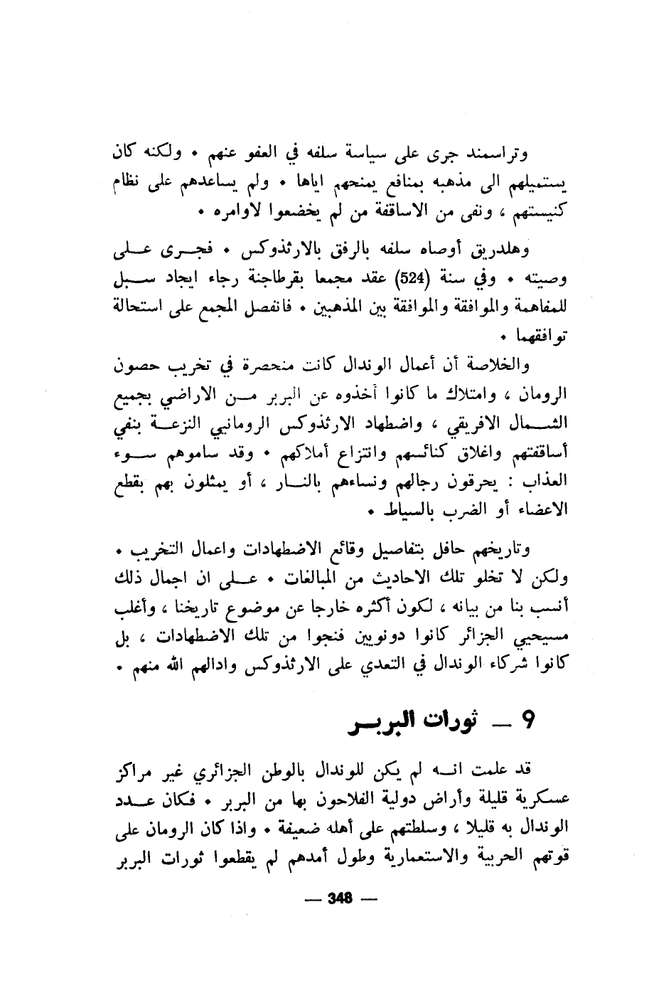 قد علمت انه لم يكن للوندال بالوطن الجزائري غير مراكز عسكرية قليلة وأراض دولية الفلاحون بها من البربر. فكان عدد الوندال به قليلا، وسلطتهم على أهله ضعيفة. وإذا كان الرومان على قوتهم الحربية والاستعمارية وطول أمدهم لم يقطعوا ثورات البربر