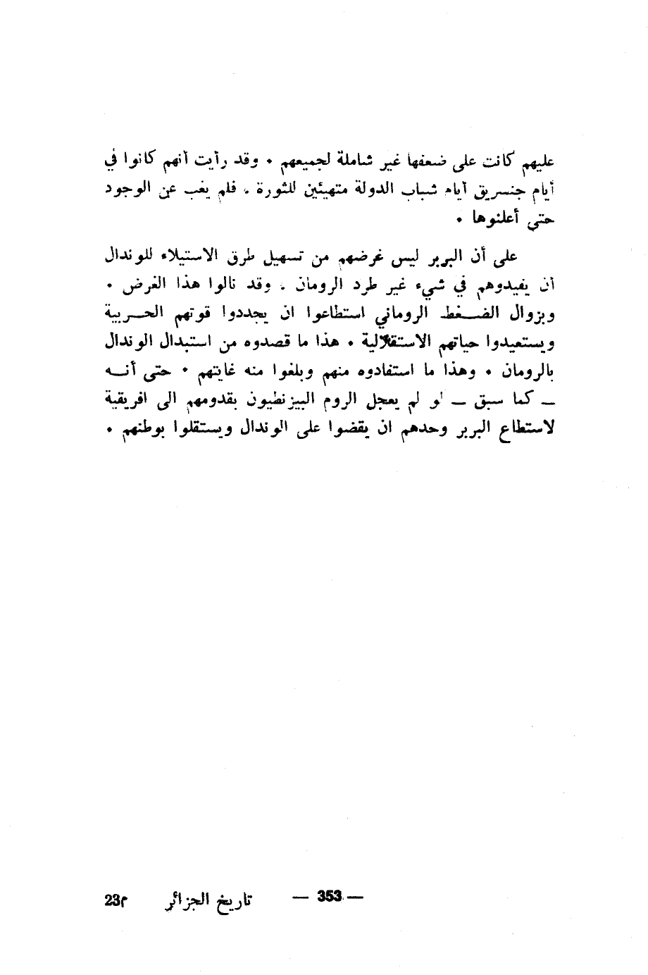 على أن البربر ليس غرضهم من تسهيل طرق الاستيلاء للوندال أن يفيدوهم في شيئ غير طرد الرومان. وقد نالوا هذا الغرض. وبزوال الضغط الروماني استطاعوا ان يجددوا قوتم الحربية ويستعيدوا حياتهم الاستقلالية. هذا ما قصدوه من استبدال الوندال بالرومان. وهذا ما استفادوه منهم وبلغوا منه غايتهم. حتى أنه - كما سبق- لو لم يعجل الروم البيزنطيون بقدومهم الى أفريقية لاستطاع البربر وحدهم ان يقضوا على الوندال ويستقلوا بوطنهه.