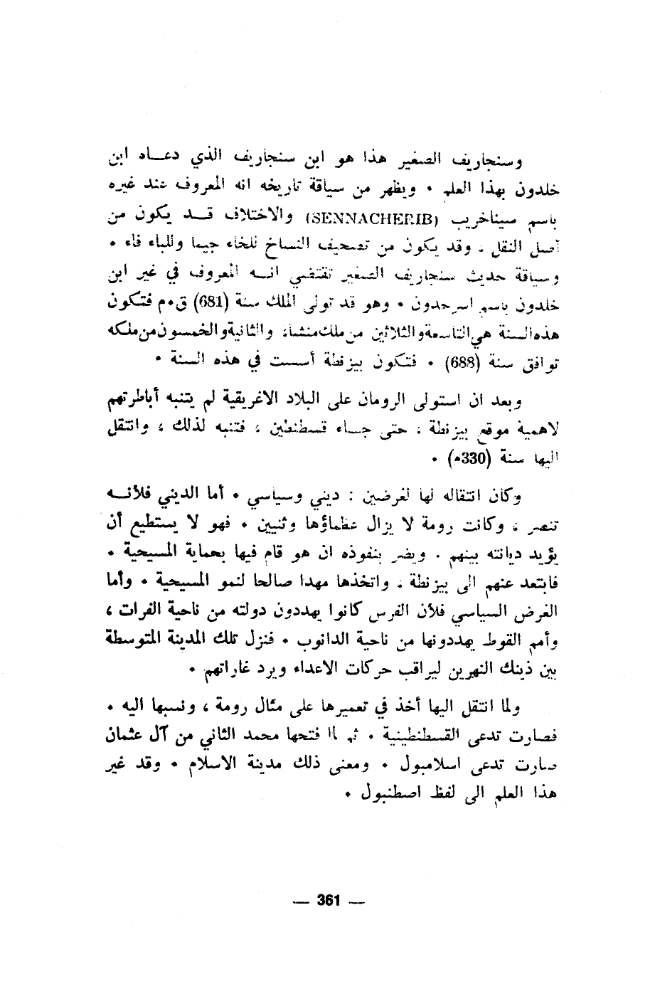وسنجاريف الصغير هذا هو ابن سنجاريف الذي دعاه ابن خلدون بهذا العلم. ويظهر من سياقة تاريخه انه المعروف عند غيره باسم سيناخريب (SENNACHERIB) والاختلاف قد يكون من أصل النقل. وقد يكون من تصحيف النساخ للخاء جيما وللباء فاء. وسياقة حديث سنجاريف الصغير تقتضي انه المعروف في غير ابن خلدون باسم اسرحدون. وهو قد تولى الملك سنة (681) ق. م فتكون هذه السنة في التاسعة والثلاثين من ملك منشا، والثانية والخمسون من ملكه توافق سنة (688). فتكون بيزنطة أسست في هذه السنة.