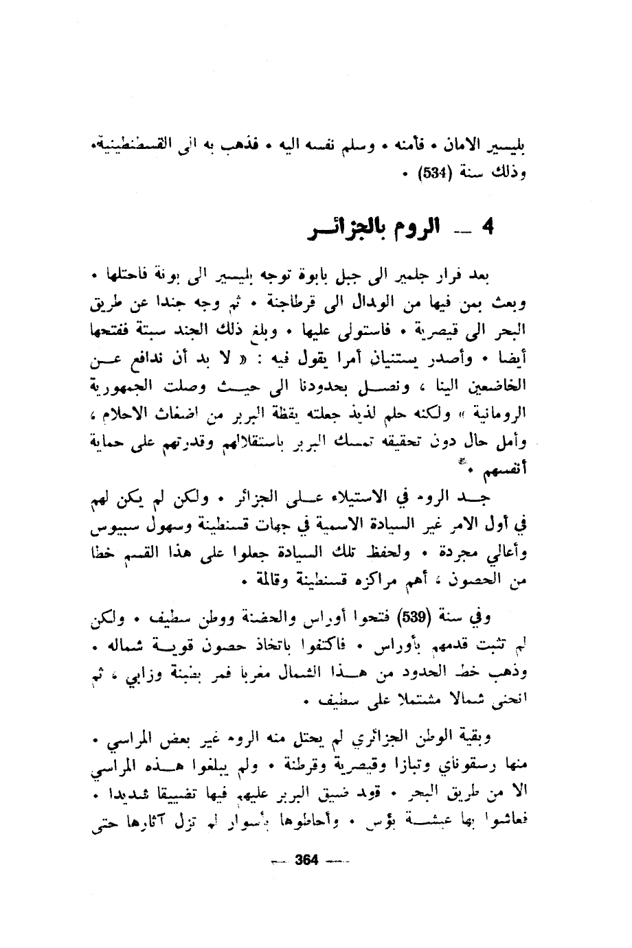 جد الروم في الاستيلاء على الجزائر. ولكن لم يكن لهم في أول الامر غير السيادة الاسمية في جهات قسنطينة وسهول سبيوس وأعالي مجردة. ولحفظ تلك السيادة جعلوا على هذا القسم خطا من الحصون، أهم مراكزه قسنطينة وقالمة.