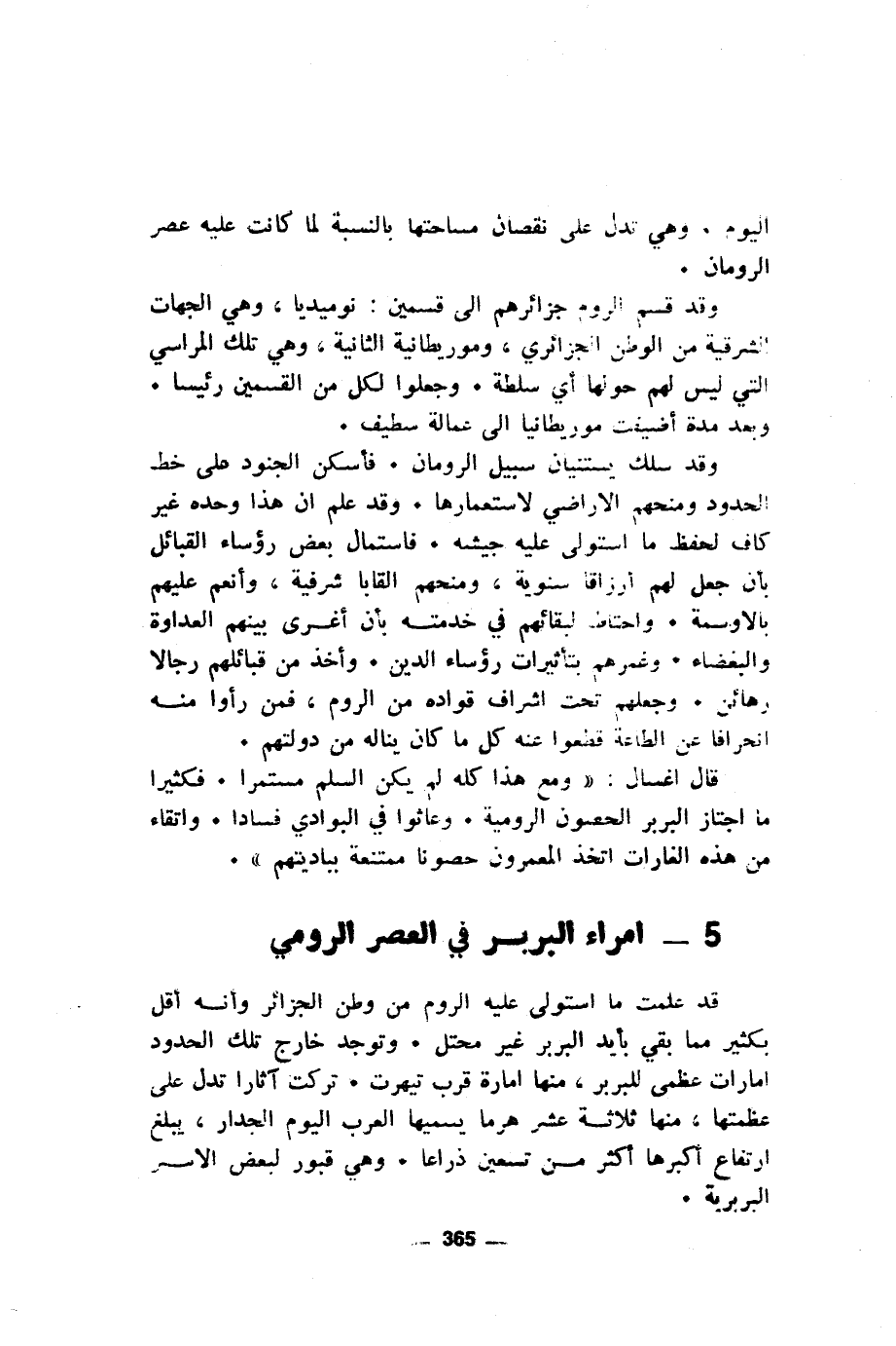 قد علمت ما استولى عليه الروم من وطن الجزائر وأنه أقل بكثير مما بقي بأيد البربر غير محتل. وتوجد خارج تلك الحدود امارات عظمى للبربر، منها امارة قرب تيهرت. تركت آثارا تدل على عظمتها، منها ثلاثة عشر هرما يسميها العرب اليوم الجدار، يبلغ ارتفاع أكبرها أكثر من تسعين ذراعا. وهي قبور لبعض الأسر البربرية.
