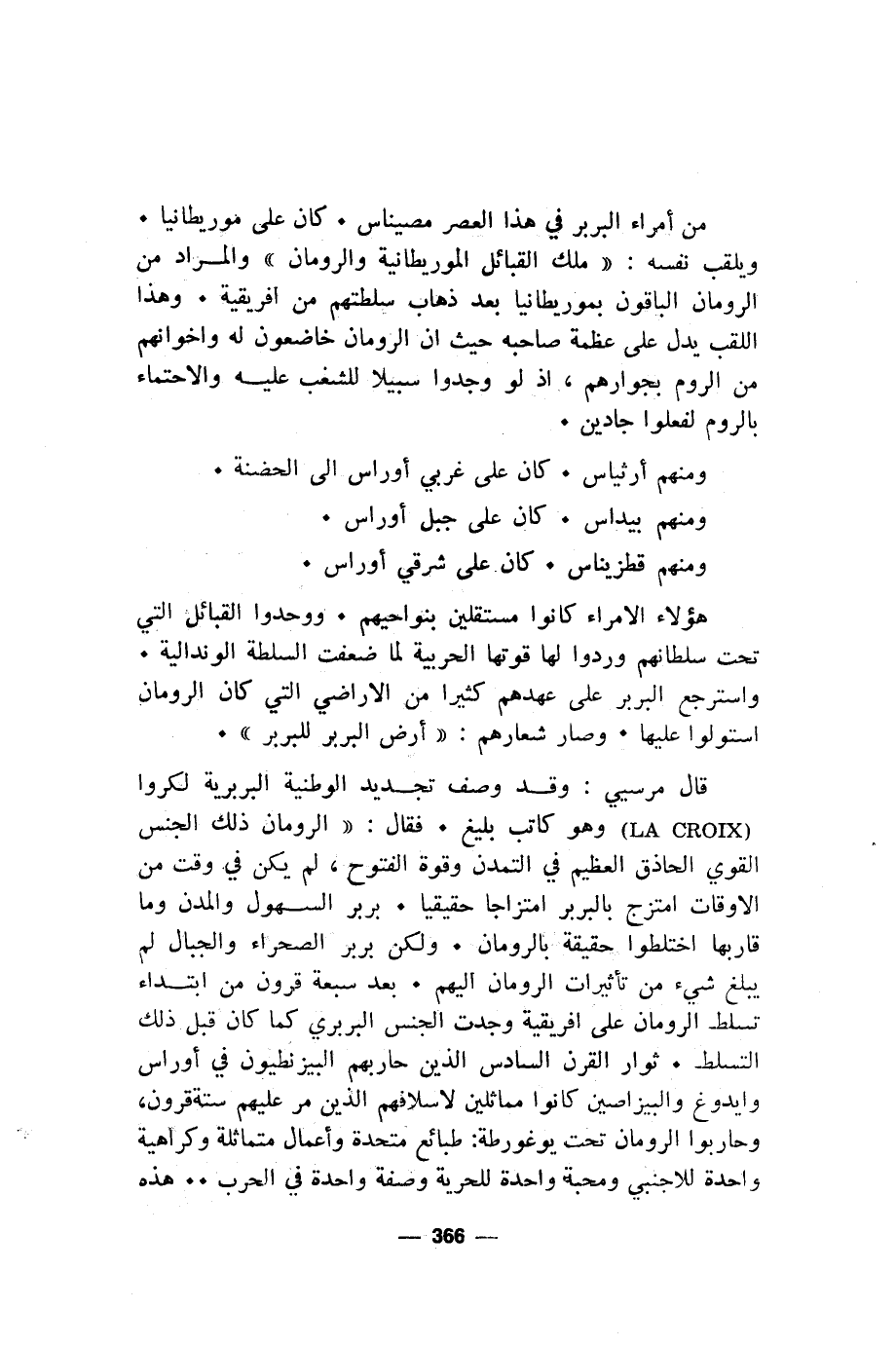 قال مرسيي: وقد وصف تجديد الوطنية البربرية لكروا (LA CROIX) وهو كاتب بليغ. فقال: "الرومان ذلك الجنس القوي الحاذق العظيم في التمدن وقوة الفتوح، لم يكن في وقت من الاوقات امتزج بالبربر امتزاجا حقيقيا. بربر السهول والمدن وما قاربها اختلطوا حقيقة بالرومان. ولكن بربر الصحراء والجبال لم يبلغ شيء من تأثيرات الرومان اليهم. بعد سبعة قرون من ابتداء تسلط الرومان على أفريقية وجدت الجنس البربري كما كان قبل ذلك التسلط. ثوار القرن السادس الذين حاربهم البيزنطيون في أوراس وايدوغ والبيزاصين كانوا مماثلين لاسلافهم الذين مر عليهم ستة قرون، وحاربوا الرومان تحت يوغورطة: طبائع متحدة وأعمال متماثلة وكراهية واحدة للاجنبي ومحبة واحدة للحرية وصفة واحدة في الحرب .. هذه