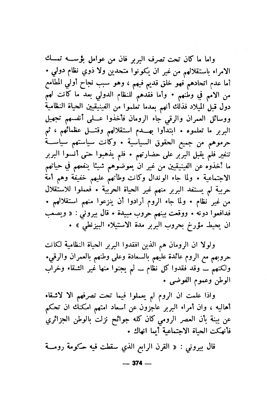ولولا ان الرومان هم الذين افقدوا البربر الحياة النظامية لكانت حروبهم مع الروم عائدة عليهم بالسعادة وعلى وطنهم بالعمران والرقي. ولكنهم- وقد فقدوا كل نظام- لم يجنوا منها غير الشقاء وخراب الوطن وعموم الفوضى.