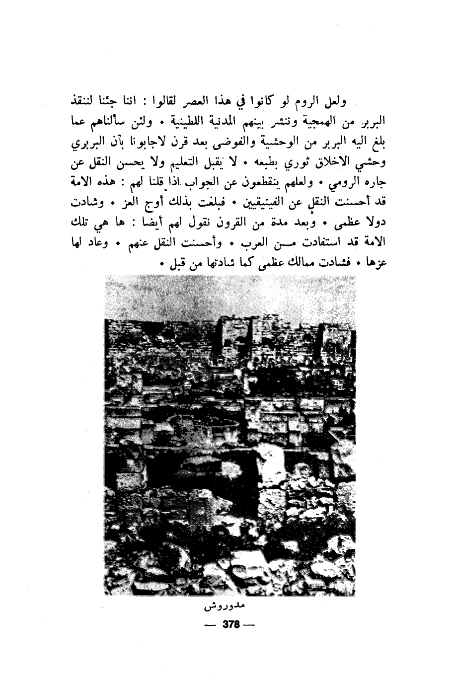 ولعل الروم لو كانوا في هذا العصر لقالوا: اننا جئنا لننقذ البربر من الهمجية وننشر بينهم المدنية اللطينية. ولئن سألناهم عما بلغ اليه البربر من الوحشية والفوضى بعد قرن لاجابونا بأن البربري وحشي الاخلاق ثوري بطبعه. لا يقبل التعليم ولا يحسن النقل عن جاره الرومي. ولعلهم ينقطعون عن الجواب إذا قلنا لهم: هذه الامة قد أحسنت النقل عن الفينيقيين. فبلغت بذلك أوج العز. وشادت دولا عظمى. وبعد مدة من القرون نقول لهم أيضا: ها هي تلك الامة قد استفادت من العرب. وأحسنت النقل عنهم. وعاد لها عزها. فشادت ممالك عظمى كما شادتها من قبل.