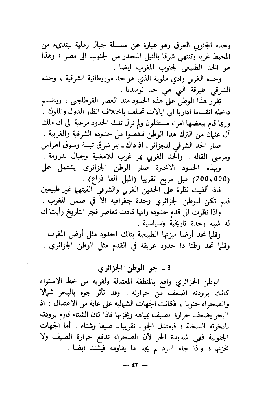 وقلما تجد أرضا ميزتها الطبيعية بتلك الحدود مثل أرض المغرب. وقلما تجد وطنا ذا حدود عريقة في القدم مثل الوطن الجزائري.