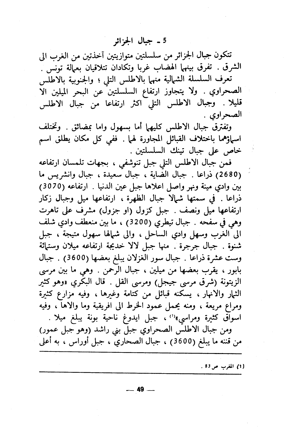 فمن جبال الاطلس التلي جبل تنوشفي، بجهات تلمسان ارتفاعه (2680) ذراعا. جبال الضاية، جبال سعيدة، جبال وانشريس ما بين وادي مينة ونهر واصل اعلاها جبل عين المدنيا. ارتفاعه (3070) ذراعا. في سمتها شمالا جبال الظهرة، ارتفاعها ميل وجبال زكار ارتفاعها ميل ونصف. جبل كزول (او جزول) مشرف على تاهرت وهي في سفحه. جبال تيطري (3200)، ما بين منعطف وادي شلف الى الغرب وسهل وادي الساحل، والى شمالها سهول متيجة، جبل شنوة. جبال جرجرة. منها جبل لالا خديجة ارتفاعه ميلان وستمائة وست عشرة ذراعا. جبال سور الغزلان يبلغ بعضها (3600). جبال بابور، يقرب بعضها من ميلين، جبال الرحمن. وهي ما بين مرسى الزيتونة (شرق مرسى جيجل) ومرسى القل. قال البكري "وهو كثير الثمار والانهار، يسكنه قبائل من كتامة وغيرها، وفيه مزارع كثيرة ومراع مريعة، ومنه يحمل عمود الخرط الى أفريقية وما والاها، وفيه اسواق كثيرة ومراسي" (¬1)، جبل ايدوغ ناحية بونة يبلغ ميلا.