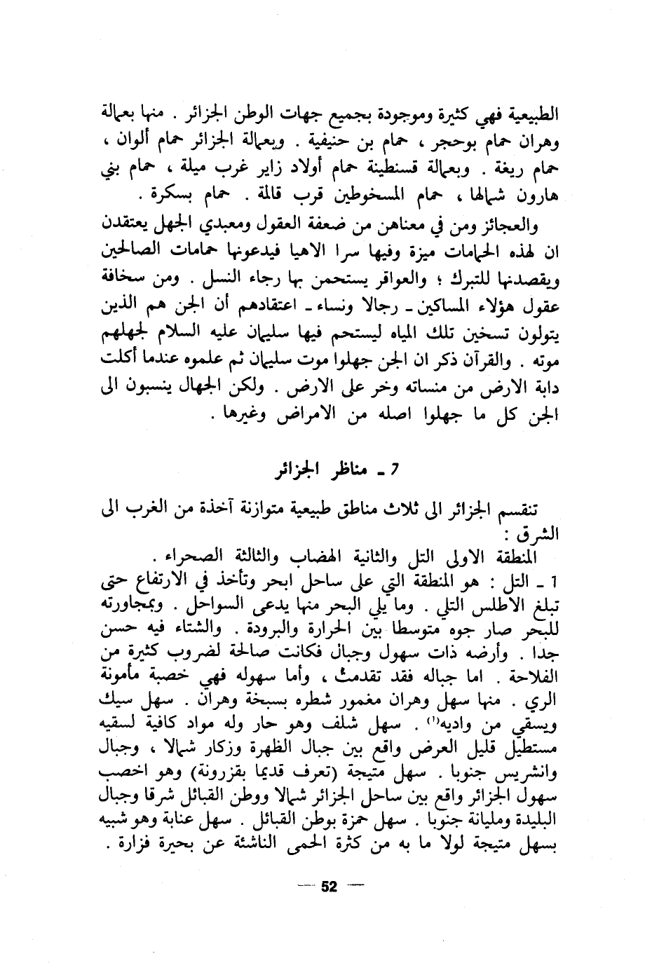1 - التل: هو المنطقة التي على ساحل ابحر وتأخذ في الارتفاع حتى تبلغ الاطلس التلي. وما يلي البحر منها يدعى السواحل. وبمجاورته للبحر صار جوه متوسطا بين الحرارة والبرودة. والشتاء فيه حسن جدا. وأرضه ذات سهول وجبال فكانت صالحة لضروب كثيرة من الفلاحة. اما جباله فقد تقدمت، وأما سهوله فهي خصبة مأمونة الري. منها سهل وهران مغمور شطره بسبخة وهران. سهل سيك ويسقى من واديه (1). سهل شلف وهو حار وله مواد كافية لساقيه مستطيل قليل العرض واقع بين جبال الظفرة وزكار شمالا، وجبال وانشريس جنوبا. سهل متيجة (تعرف قديما بقزرونة) وهو اخصب سهول الجزائر واقع بين ساحل الجزائر شمالا ووطن القبائل شرقا وجبال البليدة ومليانة جنوبا. سهل حمزة بوطن القبائل. سهل عنابة وهو شبيه بسهل متيجة لولا ما به من كثرة الحمى الناشئة عن بحيرة فزارة.