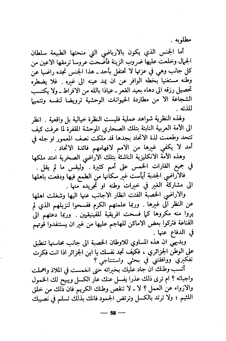وبديهي ان هذه المساوي للاوطان الخصبة الى جانب محاسنها تنطبق على الوطن الجزائري، فكيف تجد نفسك يا ابن الجزائر إذا انت فكرت تفكيري ووافقتني في بحثي واستنتاجي؟