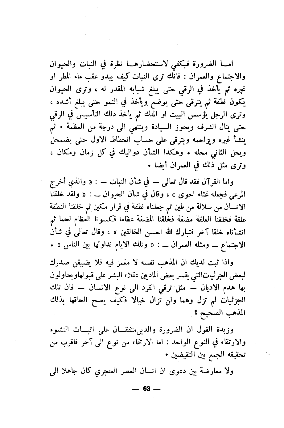 وزبدة القول ان الضرورة والدين متفقان على اثبات النشوء والارتقاء في النوع الواحد: اما الارتقاء من نوع الى آخر فاقرب من تحقيقه الحمع بين النقيضين.