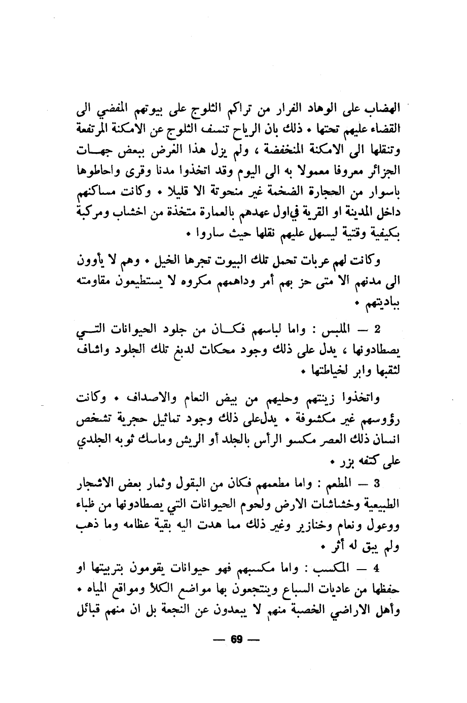 الهضاب على الوهاد الفرار من تراكم الثلوج على بيوتهم المفضي الى القضاء عليهم تحتها. ذلك بأن الرياح تنسف الثلوج عن الامكنة المرتفعة وتنقلها الى الامكنة المنخفضة، ولم يزل هذا الغرض ببعض جهات الجزائر معروفا معمولا به الى اليوم وقد اتخذوا مدنا وقرى واحاطوها باسوار من الحجارة الضخمة غير منحوتة الا قليلا. وكانت مساكنهم داخل المدينة او القرية في اول عهدهم بالعمارة متخذة من اخشاب ومركبة بكيفية وقتية ليسهل عليهم نقلها حيث ساروا.