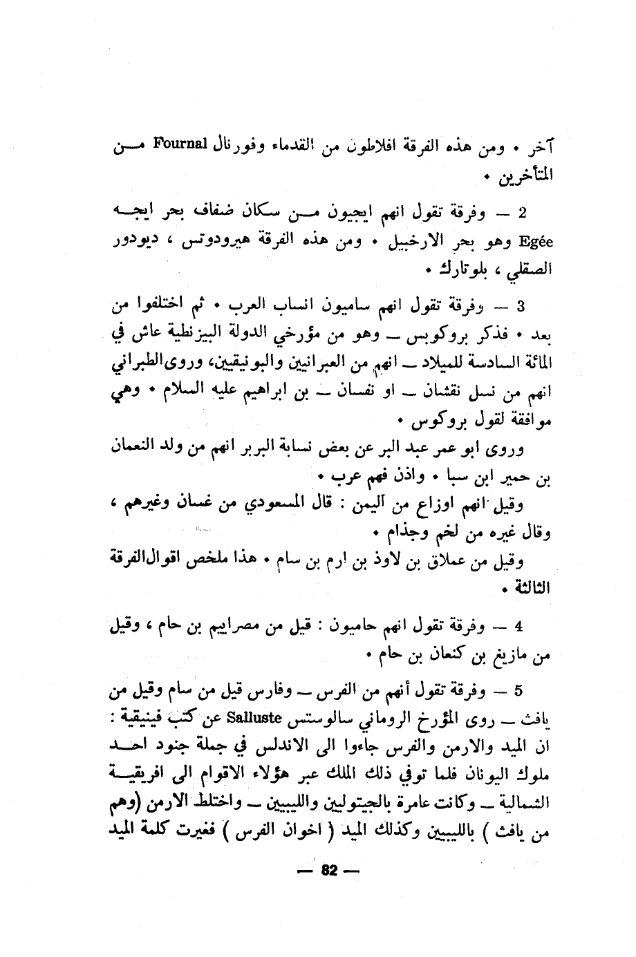 5 - وفرقة تقول أنهم من الفرس- وفارس قيل من سام وقيل من يافث- روى المؤرخ الروماني سالوستس Salluste عن كتب فينيقية: ان الميد والارمن والفرس جاءوا الى الاندلس في جملة جنود احد ملوك اليونان فلما توفي ذلك الملك عبر هؤلاء الاقوام الى أفريقية الشمالية- وكانت عامرة بالجيتوليين والليبيين- واختلط الارمن (وهم من يافث) بالليبيين وكذلك الميد (اخوان الفرس) فغيرت كلمة الميد