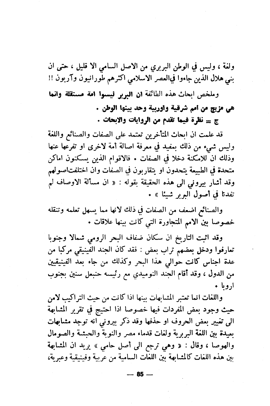 ولغة، وليس في الوطن البربري من الاصل السامي الا قليل، حتى ان بني هلال الذين جاءوا في العصر الاسلامي اكثرهم طورانيون وآريون!!