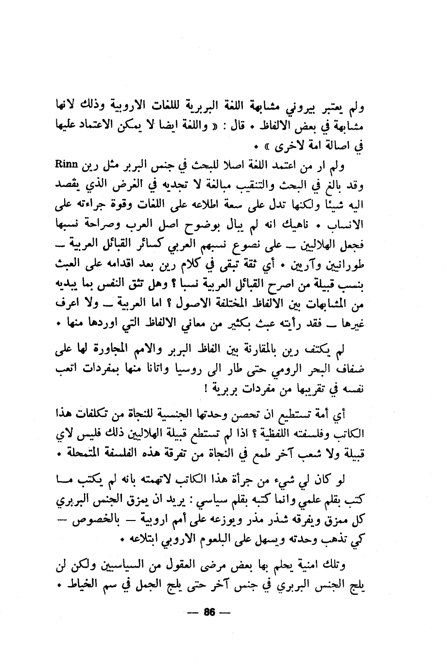 ولم ار من اعتمد اللغة اصلا للبحث في جنس البربر مثل رين Rinn وقد بالغ في البحث والتنقيب مبالغة لا تجديه في الغرض الذي يقصد اليه شيئا ولكنها تدل على سعة اطلاعه على اللغات وقوة جراءته على الانساب. ناهيك انه لم يبال بوضوح أصل العرب وصراحة نسبها فجعل الهلاليين- على نصوع نسبهم العربي كسائر القبائل العربية- طورانيين وآريين. أي ثقة تبقى في كلام رين بعد اقدامه على العبث بنسب قبيلة من اصرح القبائل الحربية نسبا؟ وهل تثق النفس بما يبديه من المشابهات بين الالفاظ المختلفة الاصول؟ اما العربية- ولا اعرف غيرها- فقد رأيته عبث بكثير من معاني الالفاظ التي اوردها منها.
