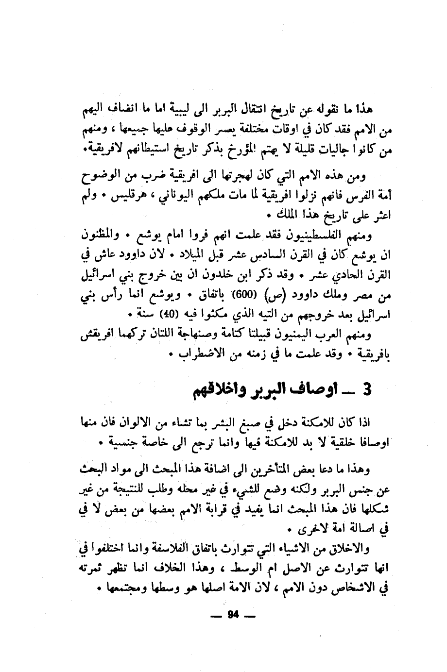 وهذا ما دعا بعض المتأخرين الى اضافة هذا البحث الى مواد البحث عن جنس البربر ولكنه وضع للشيء في غير محله وطلب للنتيجة من غير شكلها فان هذا المبحث إنما يفيد في قرابة الامم بعضها من بعض لا في في اصالة امة لاخرى.