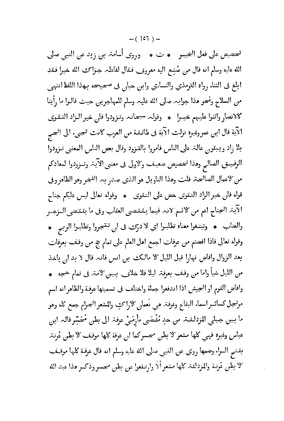تحضيض على فعل الخير ت وروى أسامة بن زيد عن النبي صلى الله عليه و سلم أنه قال من صنع إليه معروف فقال لفاعله جزاك الله خيرا فقد أبلغ في الثناء رواه الترمذي والنسائي وابن حبان في صحيحه بهذا اللفظ انتهى من السلاح ونحو هذا جوابه صلى الله عليه و سلم للمهاجرين حيث قالوا ما رأينا كالأنصار وأثنوا عليهم خيرا وقوله سبحانه تزودوا فإن خير الزاد التقوى الاية قال ابن عمر وغيره نزلت الآية في طائفة من العرب كانت تجيء إلى الحج بلا زاد ويبقون عالة على الناس فأمروا بالتزود وقال بعض الناس المعنى تزودوا الرفيق الصالح وهذا تخصيص ضعيف والأولى في معنى الآية وتزودوا لمعادكم من الأعمال الصالحة قلت وهذا التأويل هو الذي صدر به الفخر وهو الظاهر وفي قوله فإن خير الزاد التقوى حض على التقوى وقوله تعالى ليس عليكم جناح الآية الجناح أعم من الإثم لأنه فيما يقتضي العقاب وفي ما يقتضي الزجر والعتاب وتبتغوا معناه تطلبوا أي لادرك في أن تتجروا وتطلبوا الربح وقوله تعالى فإذا أفضتم من عرفات اجمع أهل العلم على تمام حج من وقف بعرفات بعد الزوال وأفاض نهارا قبل الليل إلا مالك بن أنس فإنه قال لا بد أن يأخذ من الليل شيئا وأما من وقف بعرفة ليلا فلا خلاف بين الأمة في تمام حجه وأفاض القوم أو الجيش إذا اندفعوا جملة واختلف في تسميتها عرفة والظاهر أنه اسم مرتجل كسائر اسماء البقاع وعرفة هي نعمان الأراك والمشعر الحرام جمع كله وهو ما بين جبلي المزدلفة من حد مفضي مأزمي عرفة إلى بطن محسر قاله ابن عباس وغيره فهي كلها مشعر إلا بطن محسر كما أن عرفة كلها موقف إلا بطن عرفة بفتح الراء وضمها روي عن النبي صلى الله عليه و سلم أنه قال عرفة كلها موقف إلا بطن عرفة والمزدلفة كلها مشعر إلا وارتفعوا عن بطن محسر وذكر هذا عبد الله
