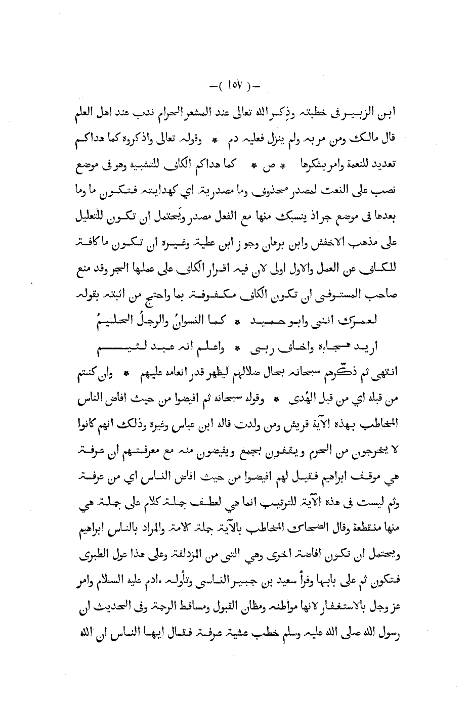ابن الزبير في خطبته وذكر الله تعالى عند المشعر الحرام ندب عند أهل العلم قال مالك ومن مربه ولم ينزل فعليه دم وقوله تعالى واذكروه كما هداكم تعديد للنعمة وأمر بشكرها ص كما هداكم الكاف للتشبيه وهو في موضع نصب على النعت لمصدر محذوف وما مصدرية أي كهدايته فتكون ما وما بعدها في موضع جر إذ ينسبك منها مع الفعل مصدر ويحتمل أن تكون للتعليل على مذهب الأخفش وابن برهان وجوز ابن عطية وغيره أن تكون ما كافة للكاف عن العمل والأول اولى لأن فيه إقرار الكاف على عملها الجر وقد منع صاحب المستوفى أن تكون الكاف مكفوفة بما واحتج من أثبته بقوله ... لعمرك إنني وأبو حميد ... كما النسوان والرجل الحليم ...