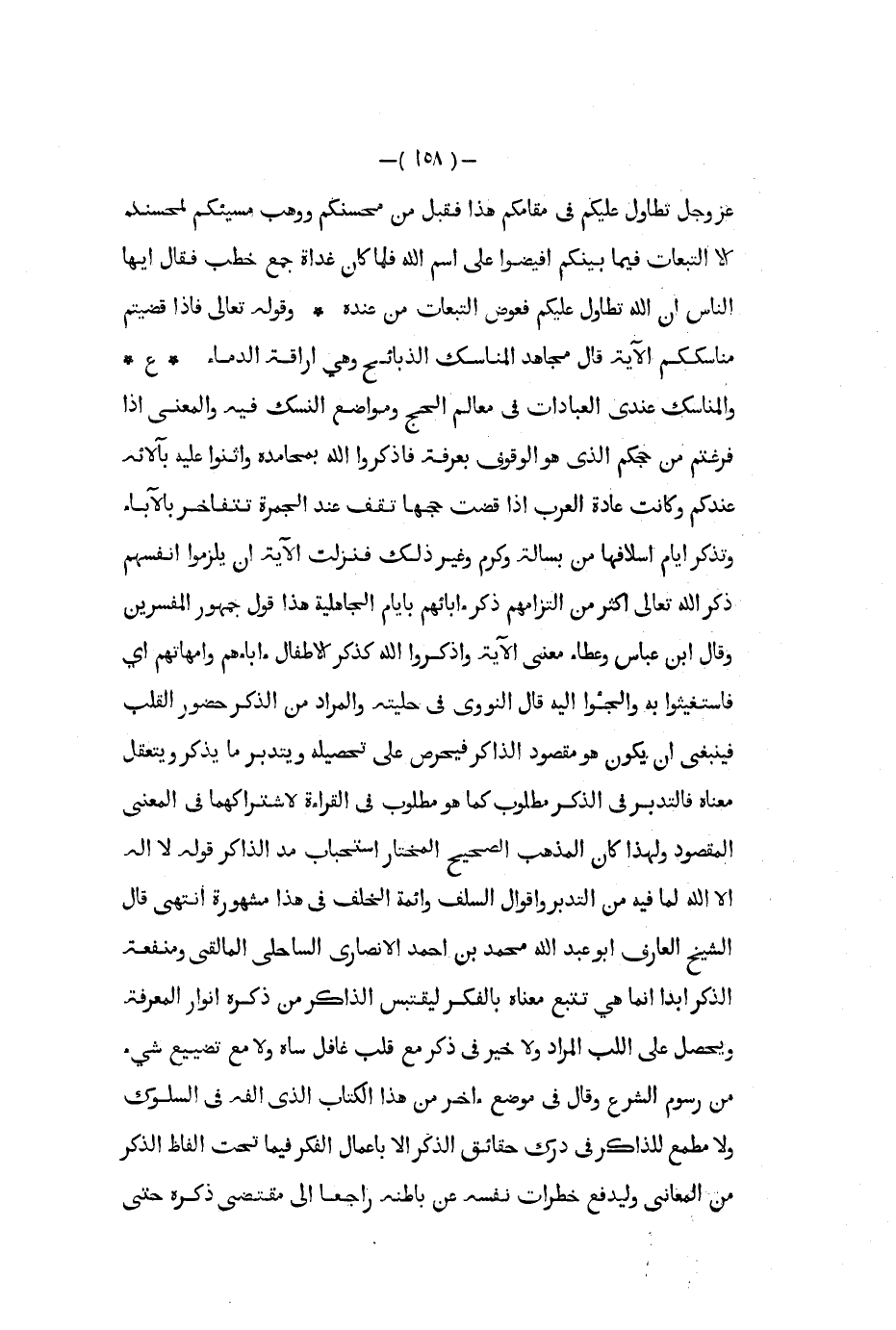 عز و جل تطاول عليكم في مقامكم هذا فقبل من محسنكم ووهب مسيئكم لمحسن إلا التبعات فيما بينكم أفيضوا على اسم الله فلما كان غداة جمع خطب فقال أيها الناس إن الله تطاول عليكم فعوض التبعات من عنده وقوله تعالى فإذا قضيتم مناسككم الآية قال مجاهد المناسك الذبائح وهي إراقة الدماء ع والمناسك عندي العبادات في معالم الحج مواضع النسك فيه والمعنى إذا فرغتم من حجكم الذي هو الوقوف بعرفة فاذكروا الله بمحامده واثنوا عليه بآلائه عندكم وكانت عادة العرب إذا قضت حجها تقف عند الجمرة تتفاخر بالآباء وتذكر أيام أسلافها من بسالة وكرم وغير ذلك فنزلت الآية إن يلزموا أنفسهم ذكر الله تعالى أكثر من التزام ذكر آبائهم بأيام الجاهلية هذا قول جمهور المفسرين وقال ابن عباس وعطاء معنى الآية واذكروا الله كذكر الأطفال آبائهم وأمهاتهم أي فاستغيثوا به والجئوا إليه قال النووي في حليته والمراد من الذكر حضور القلب فينبغي أن يكون هو مقصود الذاكر فيحرص على تحصيله ويتدبر مايذكر ويتعقل معناه فالتدبر في الذكر مطلوب كما هو مطلوب في القراءة لاشتراكهما في المعنى المقصود ولهذا كان المذهب الصحيح المختار استحباب مد الذاكر قوله لا إله إلا الله لما فيه من التدبر وأقوال السلف وأئمة الخلف في هذا مهشورة انتهى قال الشيخ العارف أبو عبد الله محمد بن أحمد الأنصاري الساحلي المالقي ومنفعة الذكر أبدا إنما هي تتبع معناه بالفكر ليقتبس الذاكر من ذكره أنوار المعرفة ويحصل على اللب المراد ولا خير في ذكر مع قلب غافل ساه ولا مع تضييع شيء من رسوم الشرع وقال في موضع آخر من هذا الكتاب الذي ألفه في السلوك ولا مطمع للذاكر في درك حقائق الذكر إلا بأعمال الفكر فيما تحت ألفاظ الذكر من المعاني وليدفع خطرات نفسه عن باطنه راجعا إلى مقتضى ذكره حتى