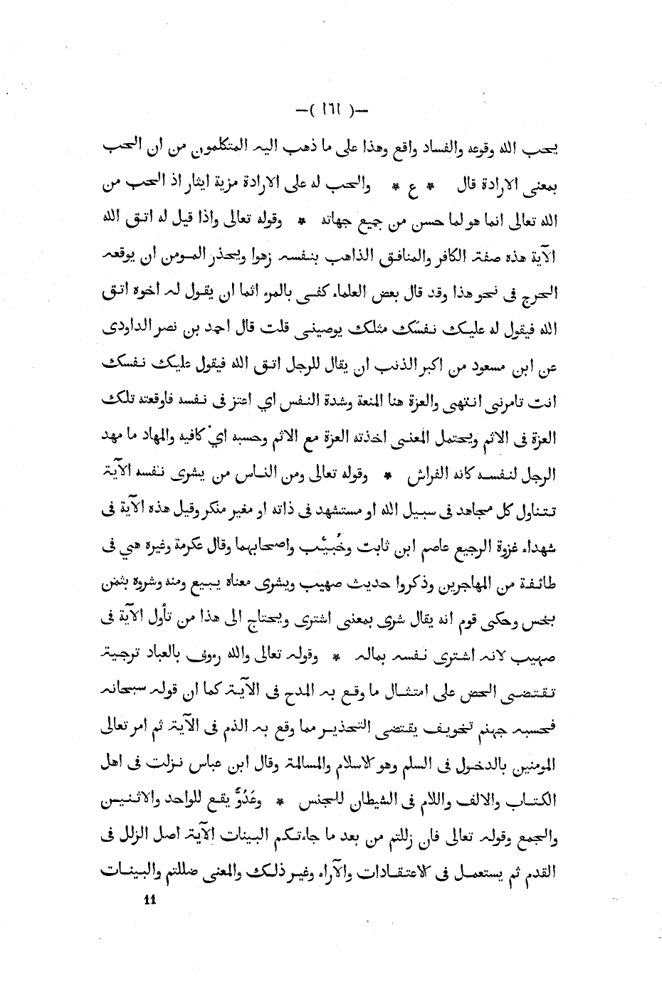 يحب الله وقوعه والفساد واقع وهذا على ما ذهب إليه المتكلمون من أن الحب بمعنى الإرادة قال ع والحب له على الإرادة مزية إيثار إذ الحب من الله تعالى إنما هو لما حسن من جميع جهاته وقوله تعالى وإذا قيل له اتق الله الآية هذه صفة الكافر والمنافق الذاهب بنفسه زهوا ويحذر المؤمن أن يوقعه الحرج في نحو هذا وقد قال بعض العلماء كفى بالمرء إثما أن يقول له أخوه اتق الله فيقول له عليك نفسك مثلك يوصيني قلت قال أحمد بن نصر الداودي عن ابن مسعود من أكبر الذنب أن يقال للرجل اتق الله فيقول عليك نفسك أنت تأمرني انتهى والعزة هنا المنعة وشدة النفس أي اعتز في نفسه فأوقعته تلك العزة في الإثم ويحتمل المعنى أخذته العزة مع الإثم وحسبه أي كافيه والمهاد ما مهد الرجل لنفسه كأنه الفراش وقوله تعالى ومن الناس من يشرى نفسه الآية تتناول كل مجاهد في سبيل الله أو مستشهد في ذاته أو مغير منكر وقيل هذه الآية في شهداء غزوة الرجيع عاصم ابن ثابت وخبيب وأصحابهما وقال عكرمة وغيره هي في طائفة من المهاجرين وذكروا حديث صهيب ويشرى معناه يبيع ومنه وشروه بمثن بخس وحكى قوم أنه يقال شرى بمعنى اشترى ويحتاج إلى هذا من تأول الآية في صهيب لأنه اشترى نفسه بماله وقوله تعالى والله رؤوف بالعباد ترجية تقتضي الحض على امتثال ما وقع به المدح في الآية كما أن قوله سبحانه فحسبه جهنم تخويف يقتضي التحذير مما وقع به الذم في الآية ثم أمر تعالى المؤمنين بالدخول في السلم وهو الإسلام والمسالمة وقال ابن عباس نزلت في أهل الكتاب والألف واللام في الشيطان للجنس وعدو يقع للواحد والاثنين والجمع وقوله تعالى فإن زللتم من بعد ما جائتكم البينات الآية أصل الزلل في القدم ثم يستعمل في الاعتقادات والآراء وغير ذلك والمعنى ضللتم والبينات