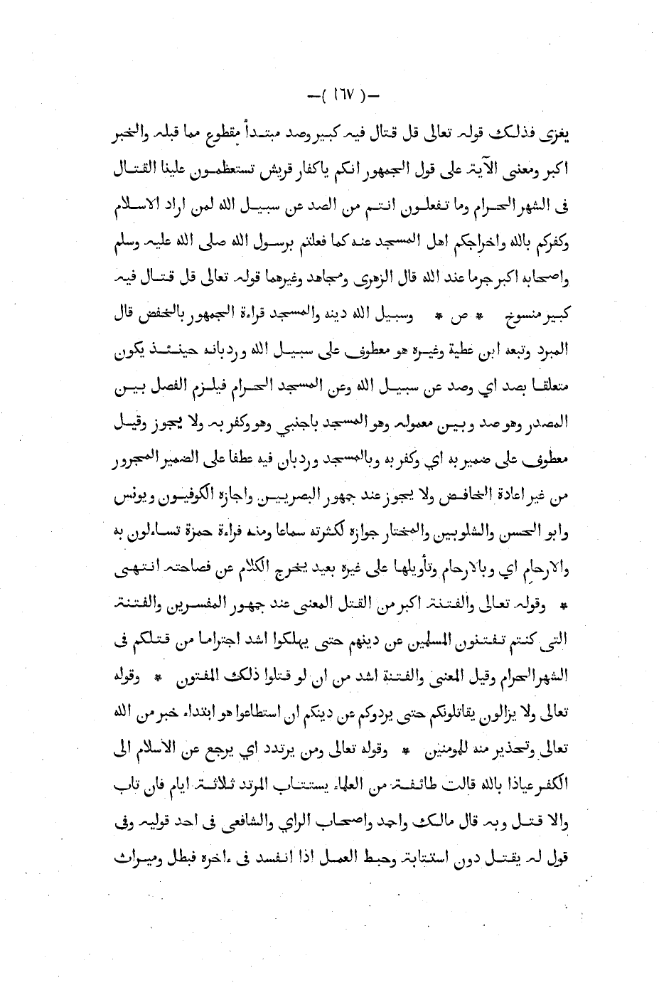يغزى فذلك قوله تعالى قل قتال فيه كبير وصد مبتدأ مقطوع مما قبله والخبر أكبر ومعنى الآية على قوم الجمهور أنكم يا كفار قريش تستعظمون علينا القتال في الشهر الحرام وما تفعلون أنتم من الصد عن سبيل الله لمن أراد الإسلام وكفركم بالله وإخراجكم أهل المسجد عنه كما فعلتم برسول الله صلى الله عليه و سلم وأصحابه أكبر جرما عند الله قال الزهري ومجاهد وغيرهما قوله تعالى قل قتال فيه كبير منسوخ ص وسبيل الله دينه والمسجد قراءة الجمهور بالخفض قال المبرد وتبعه ابن عطية وغير هو معطوف على سبيل الله ورد بأنه حينئذ يكون متعلقا بصد أي وصد عن سبيل الله وعن المسجد الحرام فيلزم الفصل بين المصدر وهو صد وبين معموله وهو المسجد باجنبي وهو وكفر به ولا يجوز وقيل معطوف على ضمير به أي وكفر به وبالمسجد ورد بأن فيه عطفا على الضمير المجرور من غير إعادة الخافض ولا يجوز عند جمهور البصريين وأجازه الكوفيون ويونس وأبو الحسن والشلوبين والمختار جوازه لكثرته سماعا ومنه قراءة حمزة تساءلون به والأرحام أي وبالارحام وتأويلها على غيره بعيد يخرج الكلام عن فصاحته انتهى وقوله تعالى والفتنة أكبر من القتل المعنى عند جمهور المفسرين والفتنة التي كنتم تفتنون المسلمين عن دينهم حتى يهلكوا أشد اجتراما من قتلكم في الشهر الحرام وقيل المعنى والفتنة اشد من أن لو قتلوا ذلك المفتون وقوله تعالى ولا يزالون يقاتلونكم حتى يردوكم عن دينكم إن استطاعوا هو ابتداء خبر من الله تعالى وتحذير منه للمؤمنين وقوله تعالى ومن يرتدد أي يرجع عن الإسلام إلى الكفر عياذا بالله قالت طائفة من العلماء يستتاب المرتد ثلاثة أيام فإن تاب وإلا قتل وبه قال مالك وأحمد وأصحاب الرأي والشافعي في أحد قوليه وفي قول له يقتل دون استتابة وحبط العمل إذا انفسد في آخره فبطل وميراث