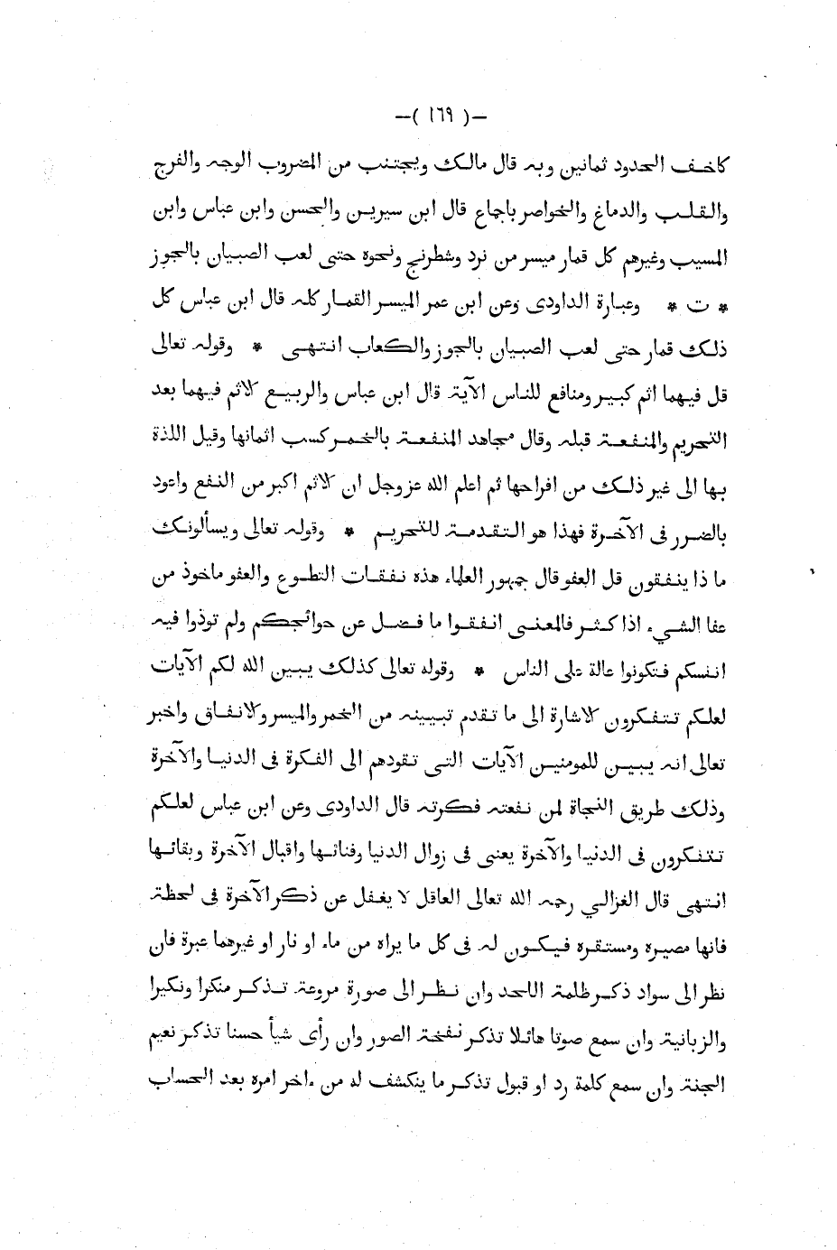 كاخف الحدود ثمانين وبه قال مالك ويجتنب من المضروب الوجه والفرج والقلب والدماغ والخواصر بإجماع قال ابن سيرين والحسن وابن عباس وابن المسيب وغيرهم كل قمار ميسر من نرد وشطرنج ونحوه حتى لعب الصبيان بالجوز ت وعبارة الداودي وعن ابن عمر الميسر القمار كله قال ابن عباس كل ذلك قمار حتى لعب الصبيان بالجوز والكعاب انتهى وقوله تعالى قل فيهما إثم كبير ومنافع للناس الآية قال ابن عباس والربيع الإثم فيهما بعد التحريم والمنفعة قبله وقال مجاهد المنفعة بالخمر كسب أثمانها وقيل اللذة بها إلى غير ذلك من افراحها ثم أعلم الله عز و جل أن الإثم أكبر من النفع وأعود بالضرر في الآخرة فهذا هو التقدمة للتحريم وقوله تعالى ويسألونك ماذا ينفقون قل العفو قال جمهور العلماء هذه نفقات التطوع والعفو مأخوذ من عفا الشيء إذا كثر فالمعنى انفقوا ما فضل عن حوائجكم ولم توذوا فيه أنفسكم فتكونوا عالة على الناس وقوله تعالى كذلك يبين الله لكم الآيات لعلكم تتفكرون الإشارة إلى ما تقدم تبيينه من الخمر والميسر والإنفاق وأخبر تعالى أنه يبين للمؤمنين الآيات التي تقودهم إلى الفكرة في الدنيا والآخرة وذلك طريق النجاة لمن نفعته فكرته قال الداودي وعن ابن عباس لعلكم تتفكرون في الدنيا والآخرة يعني في زوال الدنيا وفنائها وإقبال الآخرة وبقائها انتهى قال الغزالي رحمه الله تعالى العاقل لا يغفل عن ذكر الآخرة في لحظة فإنها مصيره مستقره فيكون له في كل ما يراه من ماء أو نار أو غيرهما عبرة فإن نظر إلى سواد ذكر ظلمة اللحد وإن نظر إلى صورة مروعة تذكر منكرا ونكيرا والزبانية وإن سمع صوتا هائلا تذكر نفخة الصور وإن رأى شيئا حسنا تذكر نعيم الجنة وإن سمع كلمة رد أو قبول تذكر ما ينكشف له من آخر أمره بعد الحساب