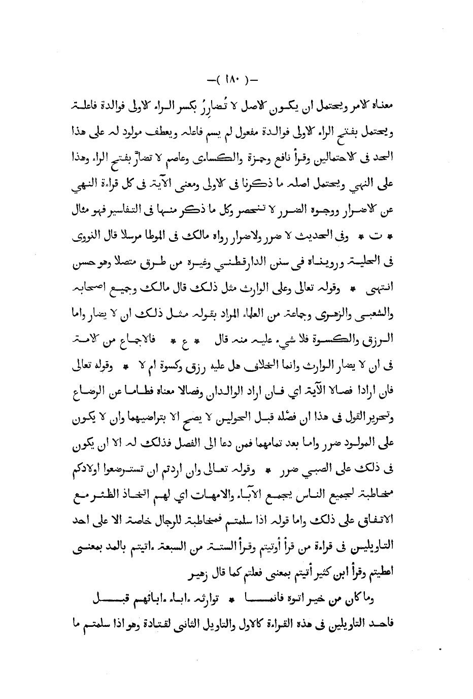 معناه الأمر ويحتمل أن يكون الأصل لا تضارر بكسر الراء الأولى فوالدة فاعلة ويحتمل بفتح الراء الأولى فوالدة مفعول لم يسم فاعله ويعطف مولود له على هذا الحد في الاحتمالين وقرأ نافع وحمزة والكسائي وعاصم لا تضار بفتح الراء وهذا على النهي ويحتمل أصله ما ذكرنا في الأولى ومعنى الآية في كل قراءة النهي عن الإضرار ووجوه الضرر لا تنحصر وكل ما ذكر منها في التفاسير فهو مثال ت وفي الحديث لا ضرر ولا ضرار رواه مالك في الموطأ مرسلا قال النووي في الحلية ورويناه في سنن الدارقطني وغيره من طرق متصلا وهو حسن انتهى وقوله تعالى وعلى الوارث مثل ذلك قال مالك وجميع أصحابه والشعبي والزهري وجماعة من العلماء المراد بقوله مثل ذلك ان لا يضار وأما الرزق والكسوة فلا شيء عليه منه قال ع فالإجماع من الأمة في أن لا يضار الوارث وإنما الخلاف هل عليه رزق وكسوة أم لا وقوله تعالى فإن أرادا فصالا الآية أي فإن أراد الوالدان وفصالا معناه فطاما عن الرضاع وتحرير القول في هذا أن فصله قبل الحولين لا يصح إلا بتراضيهما وإن لا يكون على المولود ضرر وأما بعد تمامهما فمن دعا إلى الفصل فذلك له إلا أن يكون في ذلك على الصبي ضرر وقوله تعالى وإن أردتم أن تسترضعوا أولادكم مخاطبة لجميع الناس يجمع الآباء والأمهات أي لهم اتخاذ الظئر مع الاتفاق على ذلك وأما قوله إذا سلمتم فمخاطبة للرجال خاصة إلا على أحد التأويلين في قراءة من قرا أوتيتم وقرأ الستة من السبعة ءاتيتم بالمد بمعنى أعطيتم وقرأ ابن كثير أتيتم بمعنى فعلتم كما قال زهير ... وما كان من خير أتوه فإنما ... توارثه ءاباء ءابائهم قبل ...