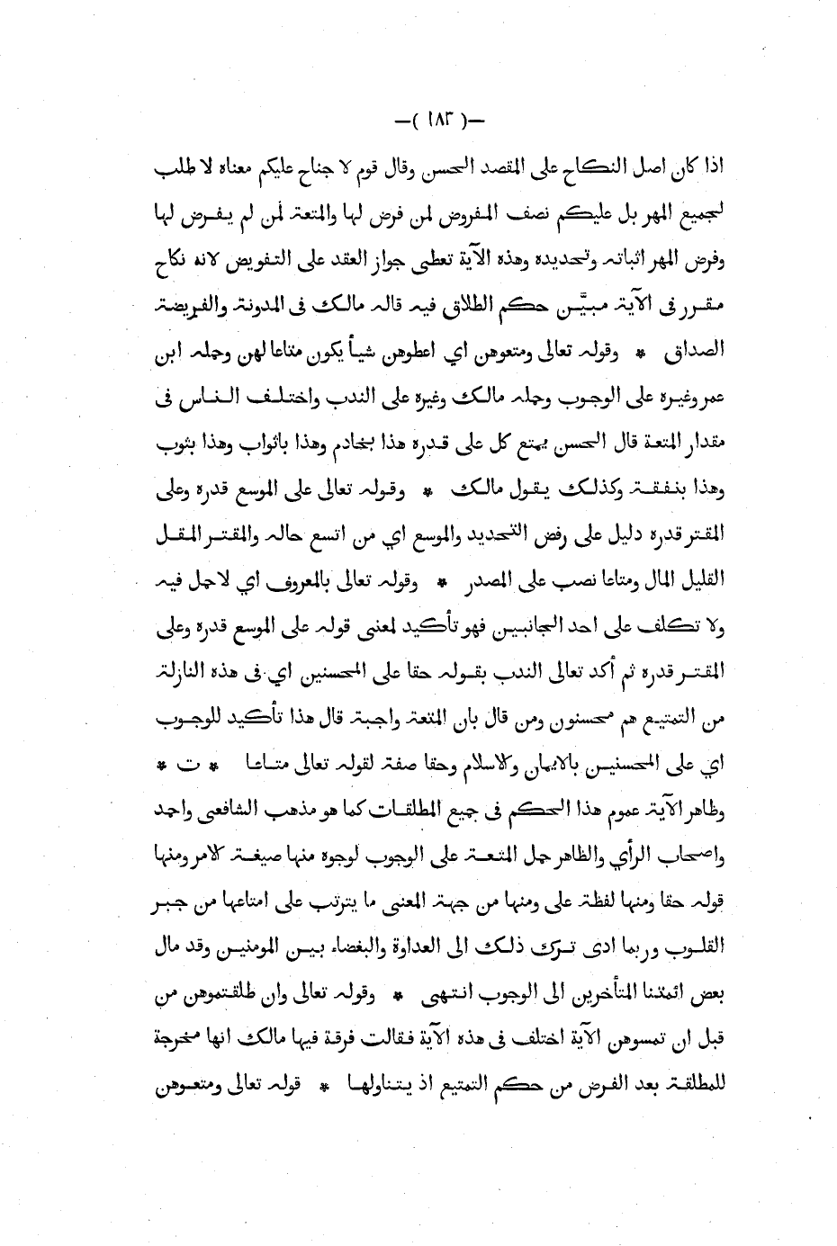 إذا كان اصل النكاح على المقصد الحسن وقال قوم لا جناح عليكم معناه لا طلب لجميع المهر بل عليكم نصف المفروض لمن فرض لها والمتعة لمن لم يفرض لها وفرض المهر اثباته وتحديده وهذه الآية تعطى جواز العقد على التفويض لأنه نكاح مقرر في الآية مبين حكم الطلاق فيه قاله مالك في المدونة والفريضة الصداق وقوله تعالى ومتعوهن أي اعطوهن شيأ يكون متاعا لهن وحمله ابن عمر وغيره على الوجوب وحمله مالك وغيره على الندب واختلف الناس في مقدار المتعة قال الحسن يمتع كل على قدره هذا بخادم وهذا باثواب وهذا بثوب وهذا بنفقة وكذلك يقول مالك وقوله تعالى على الموسع قدره وعلى المقتر قدره دليل على رفض التحديد والموسع أي من اتسع حاله والمقتر المقل القليل المال ومتاعا نصب على المصدر وقوله تعالى بالمعروف أي لا حمل فيه ولا تكلف على احد الجانبين فهو تأكيد لمعنى قوله على الموسع قدره وعلى المقتر قدره ثم أكد تعالى الندب بقوله حقا على المحسنين أي في هذه النازلة من التمتيع هم محسنون ومن قال بان المتعة واجبة قال هذا تأكيد للوجوب أي على المحسنين بالايمان والاسلام وحقا صفة لقوله تعالى متاعا ت وظاهر الآية عموم هذا الحكم في جميع المطلقات كما هو مذهب الشافعي واحمد واصحاب الرأي والظاهر حمل المتعة على الوجوب لوجوه منها صيغة الأمر ومنها قوله حقا ومنها من جهة المعنى ما يترتب على امتاعها من جبر القلوب وربما ادى ترك ذلك الى العداوة والبغضاء بين المؤمنين وقد مال بعض ائمتنا المتأخرين الى الوجوب انتهى وقوله تعالى وإن طلقتموهن من قبل أن تمسوهن الآية اختلف في هذه الآية فقالت فرقة فيها مالك انها مخرجة للمطلقة بعد الفرض من حكم التمتيع إذ يتناولها قوله تعالى ومتعوهن