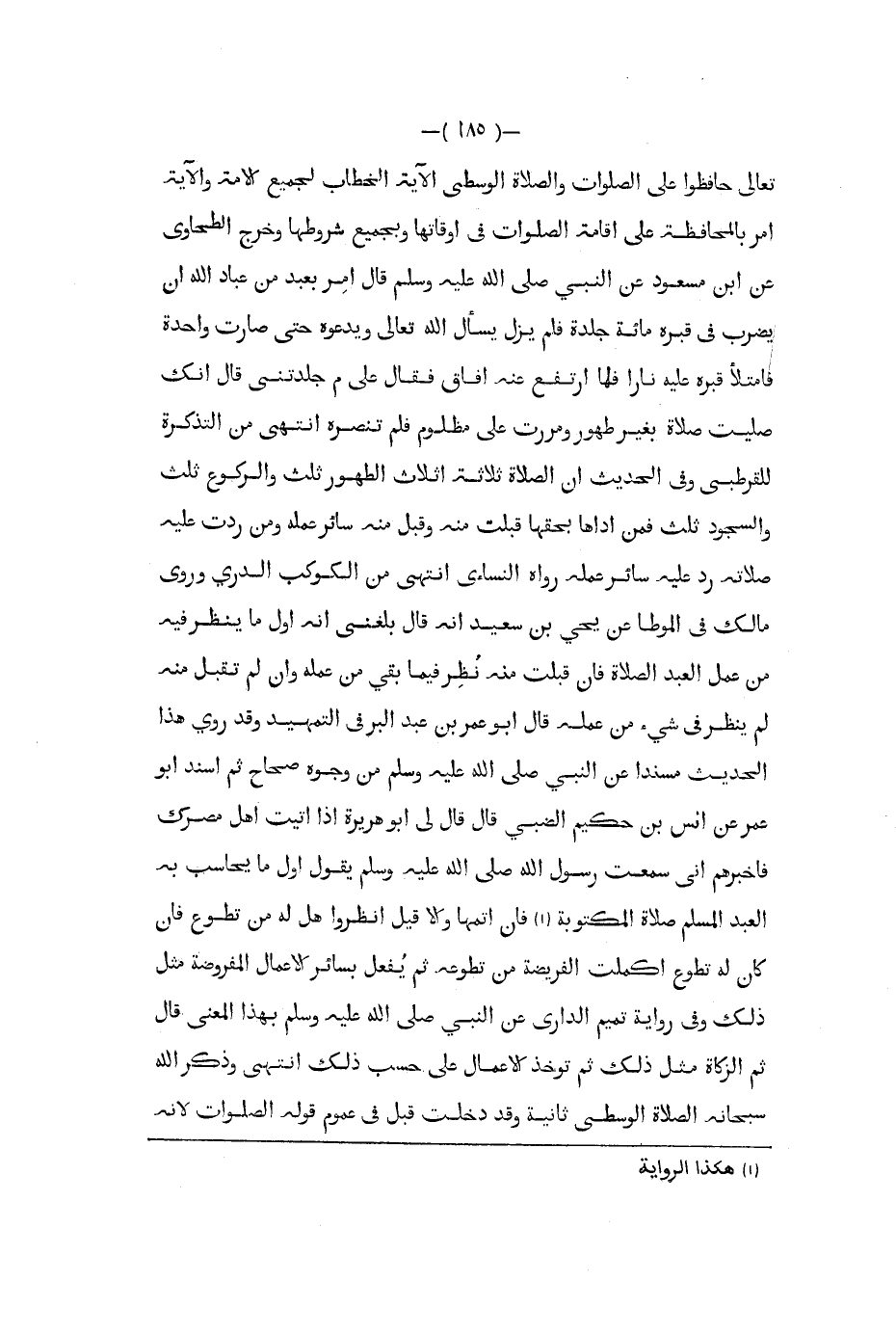 تعالى حافظوا على الصلوات والصلاة الوسطى الآية الخطاب لجميع الأمة والآية أمر بالمحافظة على اقامة الصلوات في اوقاتها بجميع شروطها وخرج الطحاوي عن ابن مسعود عن النبي صلى الله عليه و سلم قال أمر بعبد من عباد الله أن يضرب في قبره مائة جلدة فلم يزل يسأل الله تعالى ويدعوه حتى صارت واحدة فامتلأ قبره عليه نارا فلما ارتفع عنه افاق فقال على م جلدتني قال انك صليت صلاة بغير طهور ومررت على مظلوم فلم تنصره انتهى من التذكرة للقرطبي وفي الحديث أن الصلاة ثلاثة اثلاث الطهور ثلث والركوع ثلث والسجود ثلث فمن اداها بحقها قبلت منه وقبل منه سائر عمله ومن ردت عليه صلاته رد عليه سائر عمله رواه النساءى انتهى من الكوكب الدري وروى مالك في الموطأ عن يحي بن سعيد انه قال بلغنى انه اول ما ينظر فيه من عمل العبد الصلاة فان قبلت منه نظر فيما بقي من عمله وان لم تقبل منه لم ينظر في شيء من عمله قال ابو عمر بن عبد البر في التمهيد وقد روي هذا الحديث مسندا عن النبي صلى الله عليه و سلم من وجوه صحاح ثم اسند ابو عمر عن انس بن حكيم الضبي قال قال لي ابو هريرة اذا اتيت اهل مصرك فاخبرهم اني سمعت رسول الله صلى الله عليه و سلم يقول اول ما يحاسب به العبد المسلم صلاة المكتوبة فان اتمها وإلا قيل انظروا هل له من تطوع فان كان له تطوع أكملت الفريضة من تطوعه ثم يفعل بسائر الأعمال المفروضة مثل ذلك وفي رواية تميم الدارى عن النبي صلى الله عليه و سلم بهذا المعنى قال ثم الزكاة مثل ذلك ثم تؤخذ الأعمال على حسب ذلك انتهى وذكر الله سبحانه الصلاة الوسطى ثانية وقد دخلت قبل في عموم قوله الصلوات لأنه