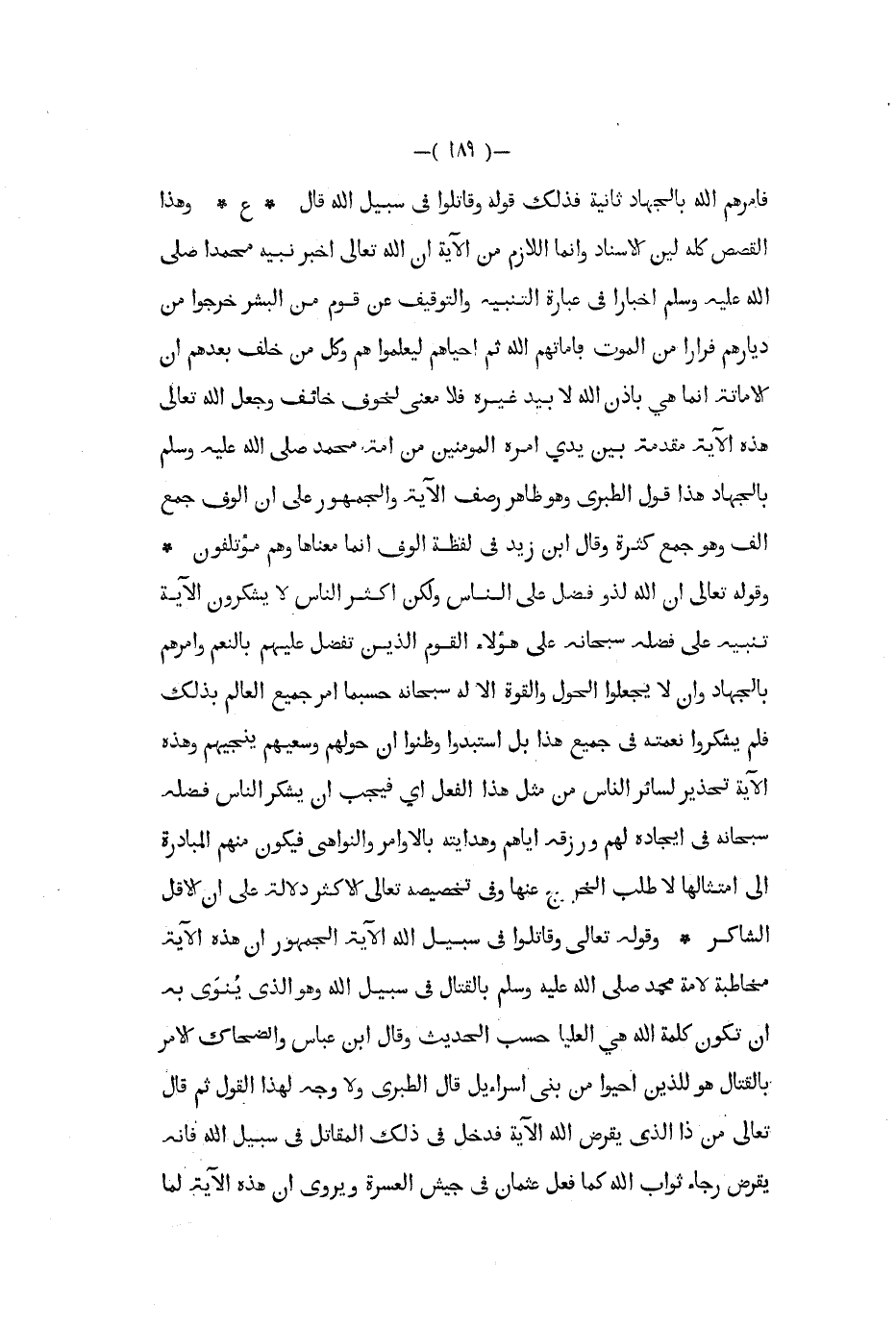 فامرهم الله بالجهاد ثانية فذلك قوله وقاتلوا في سبيل الله قال ع وهذا القصص كله لين الاسناد وانما اللازم من الآية ان الله تعالى اخبر نبيه محمدا صلى الله عليه و سلم اخبارا في عبارة التنبيه والتوقيف عن قوم من البشر خرجوا من ديارهم فرارا من الموت فاماتهم الله ثم احياهم ليعلموا هم وكل من خلف بعدهم إن الإماتة إنما هي بإذن الله لا بيد غيره فلا معنى لخوف خائف وجعل الله تعالى هذه الآية مقدمة بين يدي امره المؤمنين من أمة محمد صلى الله عليه و سلم بالجهاد هذا قول الطبري وهو ظاهر رصف الآية والجمهور على أن الوف جمع الف وهو جمع كثرة وقال ابن زيد في لفظة الوف إنما معناها وهم مؤتلفون وقوله تعالى أن الله لذو فضل على الناس ولكن اكثر الناس لا يشكرون الآية تنبيه على فضله سبحانه على هؤلاء القوم الذين تفضل عليهم بالنعم وأمرهم بالجهاد وإن لا يجعلوا الحول والقوة إلا له سبحانه حسبما أمر جميع العالم بذلك فلم يشكروا نعمته في جميع هذا بل استبدوا وظنوا أن حولهم وسعيهم ينجيهم وهذه الآية تحذير لسائر الناس من مثل هذا الفعل أي فيجب أن يشكر الناس فضله سبحانه في ايجاده لهم ورزقه اياهم وهدايته بالأوامر والنواهي فيكون منهم المبادرة إلى امتثالها لا طلب الخرص عنها وفي تخصيصه تعالى الأكثر دلالة على أن الأقل الشاكر وقوله تعالى وقاتلوا في سبيل الله الآية الجمهور أن هذه الآية مخاطبة لامة محمد صلى الله عليه و سلم بالقتال في سبيل الله وهو الذي ينوي به أن تكون كلمة الله هي العليا حسب الحديث وقال ابن عباس والضحاك الأمر بالقتال هو للذين احيوا من بني اسراءيل قال الطبري ولاى وجه لهذا القول ثم قال تعالى من ذا الذي يقرض الله الآية فدخل في ذلك المقاتل في سبيل الله فانه يقرض رجاء ثواب الله كما فعل عثمان في جيش العسرة ويروى أن هذه الآية لما