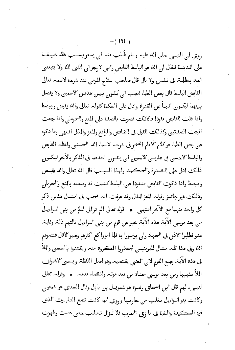 روي أن النبي صلى الله عليه و سلم طلب منه أن يسعر بسبب غلاء خيف على المدينة فقال أن الله هو الباسط القابض وأني لارجو أن القي الله ولا يتبعني أحد بمظلمة في نفس ولا مال قال صاحب سلاح المؤمن عند شرحه لاسمه تعالى القابض الباسط قال بعض العلماء يجب أن يقرن بين هذين الاسمين ولا يفصل بينهما ليكون أنبأ عن القدرة وادل على الحكمة كقوله تعالى والله يقبض ويبصط وإذا قلت القابض مفردا فكانك قصرت بالصفة على المنع والحرمان وإذا جمعت اثبتت الصفتين وكذلك القول في الخافض والرافع والمعز والمذل انتهى وما ذكره عن بعض العلماء هو كلام الإمام الفخر في شرحه لأسماء الله الحسنى ولفظه القابض والباسط الأحسن في هذين الاسمين أن يقرن أحدهما في الذكر بالآخر ليكون ذلك ادل على القدرة والحكمة ولهذا السبب قال الله تعالى والله يقبض ويبصط وأذا ذكرت القابض منردا عن الباسط كنت قد وصفته بالمنع والحرمان وذلك غير جائز وقوله المعز المذل وقد عرفت أنه يجب في أمثال هذين ذكر كل واحد منها مع الآخر أنتهى قوله تعالى ألم تر إلى الملإ من بني اسراءيل من بعد موسى الآية هذه الآية خبر عن قوم من بني اسراءيل نالتهم ذلة وغلبة عدو فطلبوا الاذن في الجهاد وأن يومروا به فلما أمروا كع أكثرهم وصبر الاقل فنصرهم الله وفي هذا كله مثال للمؤمنين ليحذروا المكروه منه ويقتدوا بالحسن والملأ في هذه الاية جميع القوم لان المعنى يقتضيه وهو أصل اللفظة ويسمى الأشراف الملأ تشبيها ومن بعد موسى معناه من بعد موته وأنقضاء مدته وقوله تعالى لنبيء لهم قال ابن اسحاق وغيره هو شمويل بن بابل وقال السدي هو شمعون وكانت بنو اسراءيل تغلب من حاربها وروي انها كانت تضع التابوت الذي فيه السكينة والبقية في مأزق الحرب فلا تزال تغلب حتى عصت وظهرت