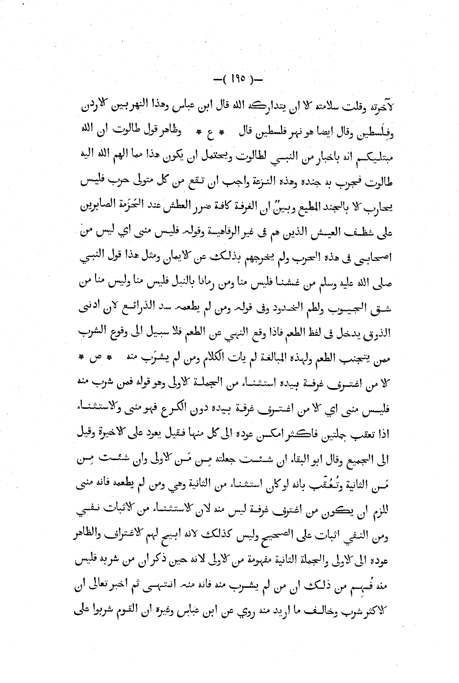 لآخرته وقلت سلامته إلا أن يتداركه الله قال ابن عباس وهذا النهر بين الأردن وفلسطين وقال أيضا هو نهر فلسطين قال ع وظاهر قول طالوت إن الله مبتليكم أنه بإخبار من النبي لطالوت ويحتمل أن يكون هذا مما الهم الله إليه طالوت فجرب به جنده وهذا النزعة واجب أن تقع من كل متولي حرب فليس يحارب إلا بالجند المطيع وبين أن الغرفة كافة ضرر العطش عند الحزمة الصابرين على شظف العيش الذين هم في غير الرفاهية وقوله فليس منى أي ليس من أصحابي في هذه الحرب ولم يخرجهم بذلك عن الإيمان ومثل هذا قول النبي صلى الله عليه و سلم من غشنا فليس منا ومن رمانا بالنبل فليس منا وليس منا من شق الجيوب ولطم الخدود وفي قوله ومن لم يطعمه سد الذرائع لأن أدنى الذوق يدخل في لفظ الطعم فإذا وقع النهي عن الطعم فلا سبيل إلى وقوع الشرب ممن يتجنب الطعم ولهذه المبالغة لم يأت الكلام ومن لم يشرب منه ص إلا من أغترف غرفة بيده استثناء من الجملة الأولى وهو قوله فمن شرب منه فليس مني أي إلا من اغترف غرفة بيده دون الكرع فهو مني والاستثناء إذا تعقب جملتين فأكثر أمكن عوده إلى كل منها فقيل يعد علىالأخير وقيل إلى الجميع وقال أبو البقاء إن شئت جعلته من من الأولى وإن شئت من من الثانية وتعقب بأنه لو كان استثناء من الثانية وهي ومن لم يطعمه فإنه مني للزم أن يكون من اغترف غرفة ليس منه لأن الإستثناء من الإثبات نفي من النفي إثبات على الصحيح وليس كذلك لأنه أبيح لهم الاغتراف والظاهر عوده إلى الأولى والجملة الثانية مفهومة من الأولى لأنه حين ذكر أن من شربه فليس منه فهم من ذلك أن من لم يشرب منه فإنه منه انتهى ثم أخبر تعالى أن الأكثر شرب خالف ما أريد منه روي عن ابن عباس وغيره أن القوم شربوا على