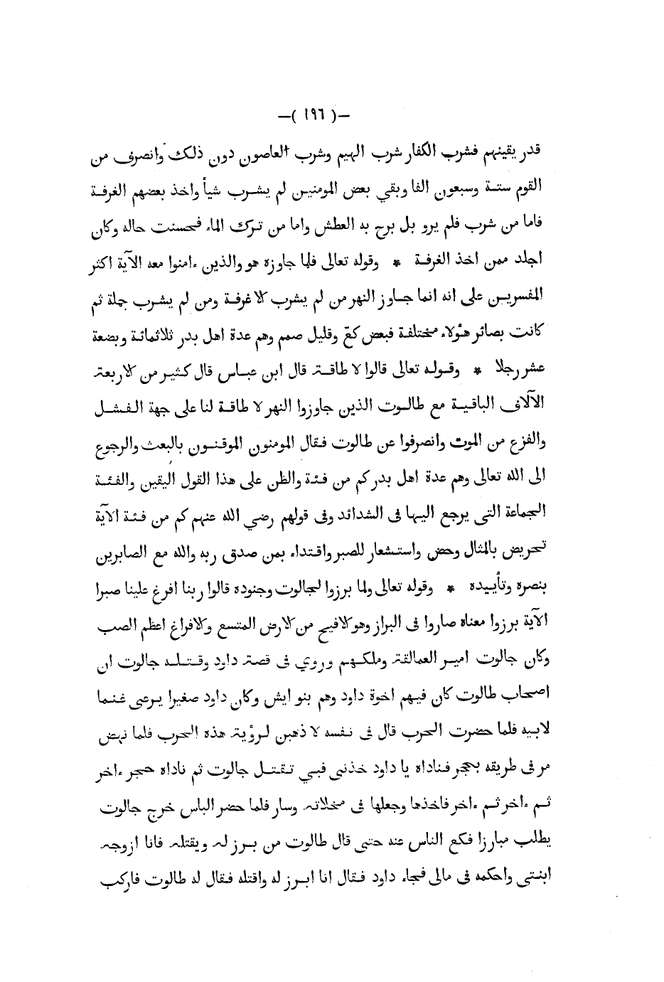 قدر يقينهم فشرب الكفار شرب اليهم وشرب العاصون دون ذلك وأنصرف من القوم ستة وسبعون ألفا وبقي بعض المؤمنين لم يشرب شيئا وأخذ بعضهم الغرفة فاما من شرب فلم يرو بل برح به العطش وأما من ترك الماء فحسنت حاله وكان أجلد ممن أخذ الغرفة وقوله تعالى فلما جاوزه هو والذين آمنوا معه الآية أكثر المفسرين على أنه إنما جاوز النهر من لم يشرب إلا غرفة ومن لم يشرب جملة ثم كانت بصائر هؤلاء مختلفة فبعض كع وقليل صمم وهم عدة أهل بدر ثلاثمائة وبضعة عشر رجلا وقوله تعالى قالوا لا طاقة قال ابن عباس قال كثير من الأربعة الآلاف الباقية مع طالوت الذين جاوزوا النهر لا طاقة لنا على جهة الفشل والفزع من الموت وأنصرفوا عن طالوت فقال المؤمنون الموقنون بالبعث والرجوع إلى الله تعالى وهم عدة أهل بدر كم من فئة والظن على هذا القول اليقين والفئة الجماعة التي يرجع إليها في الشدائد وفي قولهم رضي الله عنهم كم من فئة الآية تحضريض بالمثال وحض واستشعار للصبر واقتداء بمن صدق ربه والله مع الصابرين بنصره وتأييده وقوله تعالى ولما برزوا لجالوت وجنوده قالوا ربنا أفرغ علينا صبرا الآية برزوا معناه صاروا في البراز وهو الافيح من الأرض المتسع والإفراغ أعظم الصب وكان جالوت أمير العمالقة وملكهم وروي في قصة داود وقتله جالوت أن أصحاب طالوت كان فيهم أخوة داود وهم بنوو أيش وكان داود صغيرا يرعى غنما لابيه فلما حضرت الحرب قال في نفسه لأذهبن لرؤية هذه الحرب فلما نهض مر في طريقه بحجر فناداه يا داود خذني فبي تقتل جالوت ثم ناداه حجر آخر ثم أخر ثم أخر فأخذها وجعلها في مخلاته وسار فلما حضر البأس خرج جالوت يطلب مبارزا فكع الناس عنه حتى قال طالوت من برز له ويقتله فأنا أزوجه ابنتي وأحكمه في مالي فجاء داود فقال أنا أبرز له واقتله فقال له طالوت فأركب