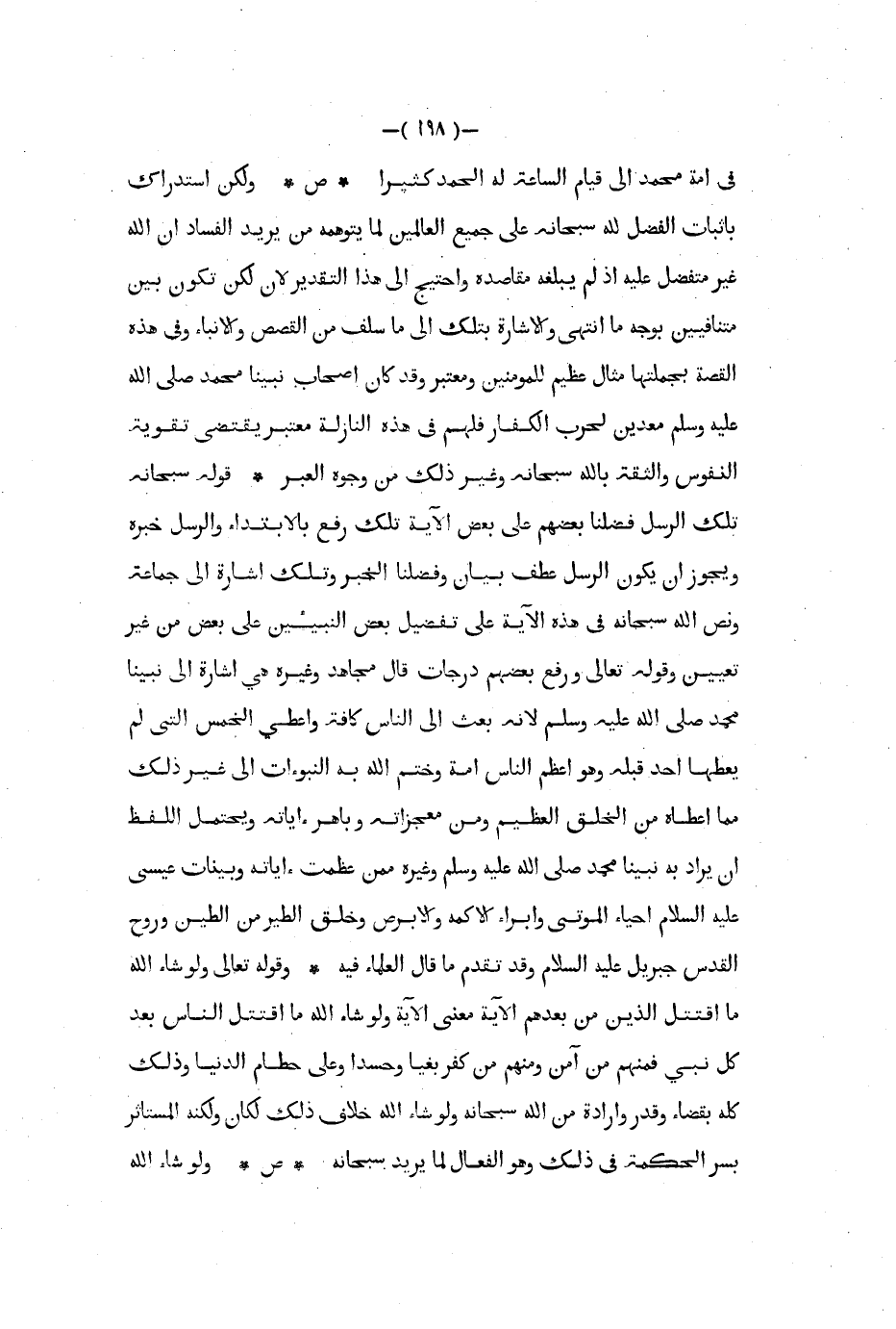 في أمة محمد إلى قيام الساعة له الحمد كثيرا ص ولكن استدراك بإثبات الفضل لله سبحانه على جميع العالمين لما يتوهمه من يريد الفساد أن الله غير متفضل عليه إذ لم يبلغه مقاصده واحتيج إلى هذا التقدير لأن لكن تكون بين متنافيين بوجه ما انتهى والإشارة بتلك إلى ما سلف من القصص والأنباء وفي هذه القصة بجملتها مثال عظيم للمؤمنين ومعتبر وقد كان أصحاب نبينا محمد صلى الله عليه و سلم معدين لحرب الكفار فلهم في هذه النازلة معتبر يقتضي تقوية النفوس والثقة بالله سبحانه وغير ذلك من وجوه العبر قوله سبحانه تلك الرسل فضلنا بعضهم على بعض الآية تلك رفع بالابتداء والرسل خبره ويجوز أن يكون الرسل عطف بيان وفضلنا الخبر وتلك إشارة إلى جماعة ونص الله سبحانه في هذه الآية على تفضيل بعض النبيين على بعض من غير تعيين وقوله تعالى ورفع بعضهم درجات قال مجاهد وغيره هي إشارة إلى نبينا محمد صلى الله عليه و سلم لأنه بعث إلى الناس كافة وأعطي الخمس التي لم يعطها أحد قبله وهو أعظم الناس أمة وختم الله به النبوءات إلى غير ذلك مما أعطاه من الخلق العظيم ومن معجزاته وباهر آياته ويحتمل اللفظ أن يراد به نبينا محمد صلى الله عليه و سلم وغيره ممن عظمت ءاياته وبينات عيسى عليه السلام أحياء الموتى وإبراء الأكمة والأبرص وخلق الطير من الطين وروح القدس جبريل عليه السلام وقد تقدم ما قال العلماء فيه وقوله تعالى ولو شاء الله ما اقتتل الذين من بعدهم الآية معنى الآية ولو شاء الله ما اقتتل الناس بعد كل نبي فمنهم من آمن ومنهم من كفر بغيا وحسدا وعلى حطام الدنيا وذلك كله بقضاء وقدر وإرادة من الله سبحانه ولو شاء الله خلاف ذلك لكان ولكنه المستأثر بسر الحكمة في ذلك وهو الفعال لما يريد سبحانه ص ولو شاء الله