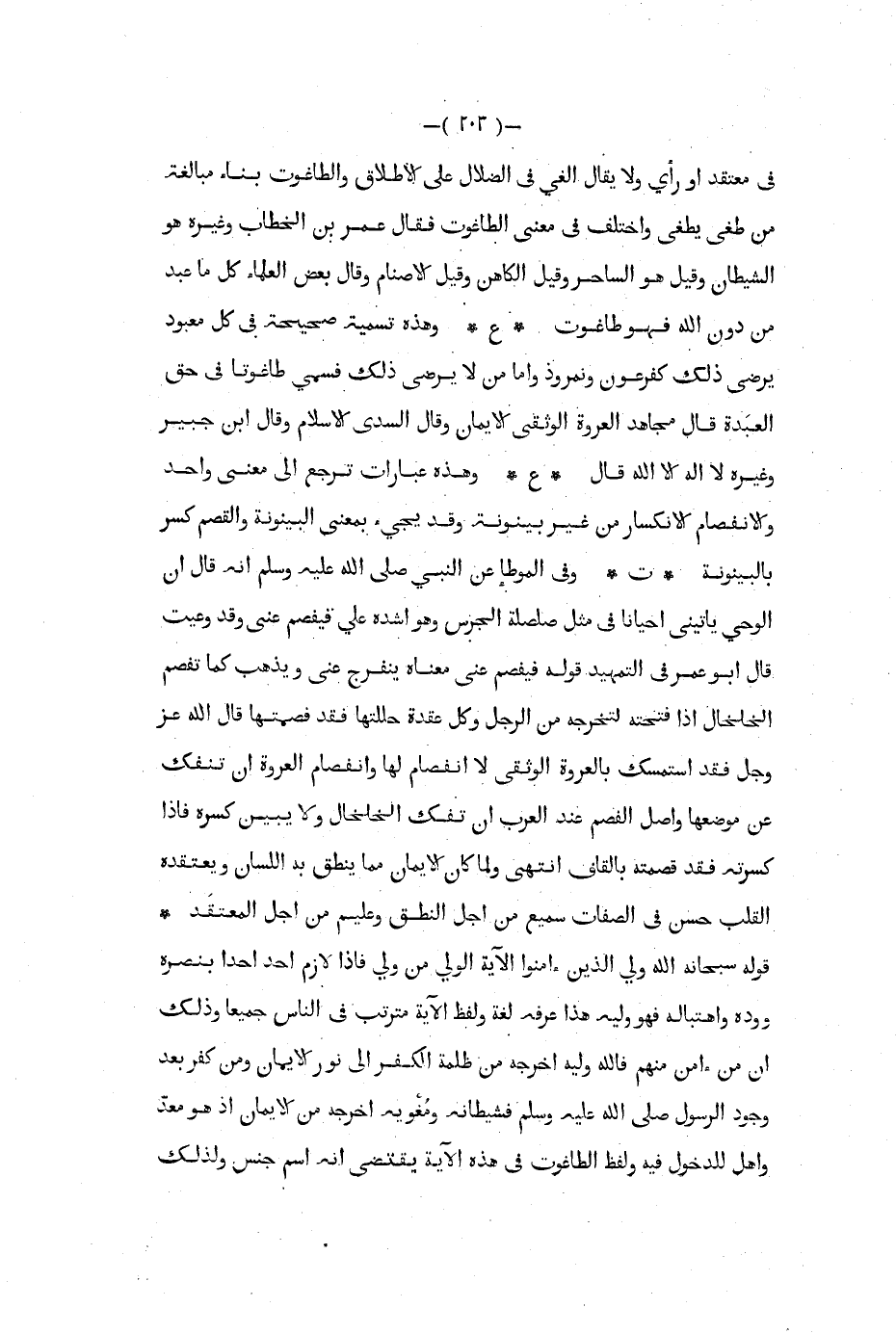 في معتقد أو رأي ولا يقال الغي في الضلال على الإطلاق والطاغوت بناء مبالغة من طغى يطغي واختلف في معنى الطاغوت فقال عمر بن الخطاب وغيره هو الشيطان وقيل هو الساحر وقيل الكاهن وقيل الأصنام وقال بعض العلماء كل ما عبد من دون الله فهو طاغوت ع وهذه تسمية صحيحة في كل معبود يرضى ذلك كفرعون ونمروذ وأما من لا يرضى ذلك فسمي طاغوتا في حق العبدة قال مجاهد العروة الوثقى الإيمان وقال السدي الإسلام وقال ابن جبير وغيره لا إله إلا الله قال ع وهذه عبارات ترجع إلى معنى واحد والانفصام الانكسار من غير بينونة وقد يجيء بمعنى البينونة والقصم كسر بالبينونة ت وفي الموطأ عن النبي صلى الله عليه و سلم أنه قال إن الوحي يأتيني أحيانا في مثل صلصلة الجرس وهو أشده علي فيفصم عني وقد وعيت قال أبو عمر في التمهيد قوله فيفصم عني معناه ينفرج عني ويذهب كما تفصم الخلخال إذا فتحته لتخرجه من الرجل وكل عقدة حللتها فقد فصمتها قال الله عز و جل فقد استمسك بالعروة الوثقى لا انفصام لها وانفصام العروة أن تنفك عن موضعها واصل الفصم عند العرب أن تفك الخلخال ولا يبين كسره فإذا كسرته فقد قصمته بالقاف انتهى ولما كان الإيمان مما ينطق به اللسان ويعتقده القلب حسن في الصفات سميع من أجل النطق وعليم من أجل المعتقد قوله سبحانه الله ولي الذين آمنوا الآية الولي من ولي فإذا لازم أحدا أحدا بنصره ووده واهتباله فهو وليه هذا عرفه لفة ولفظ اية مترتب في الناس جميعا وذلك ان من آمن منهم فالله وليه أخرجه من ظلمة الكفر إلى نور الإيمان ومن كفر بعد وجود الرسول صلى الله عليه و سلم فشيطانه ومغوية أخرجه من الإيمان إذ هو معد وأهل للدخول فيه ولفظ الطاغوت في هذه الآية يقتضي أنه اسم جنس ولذلك